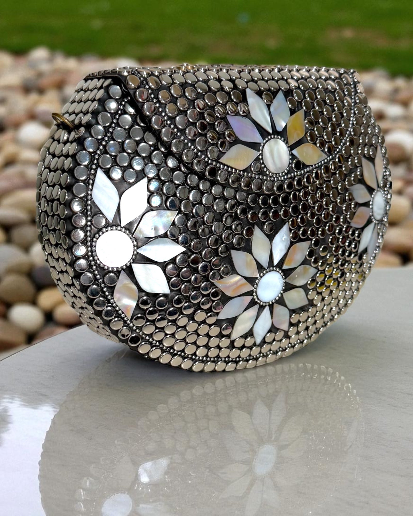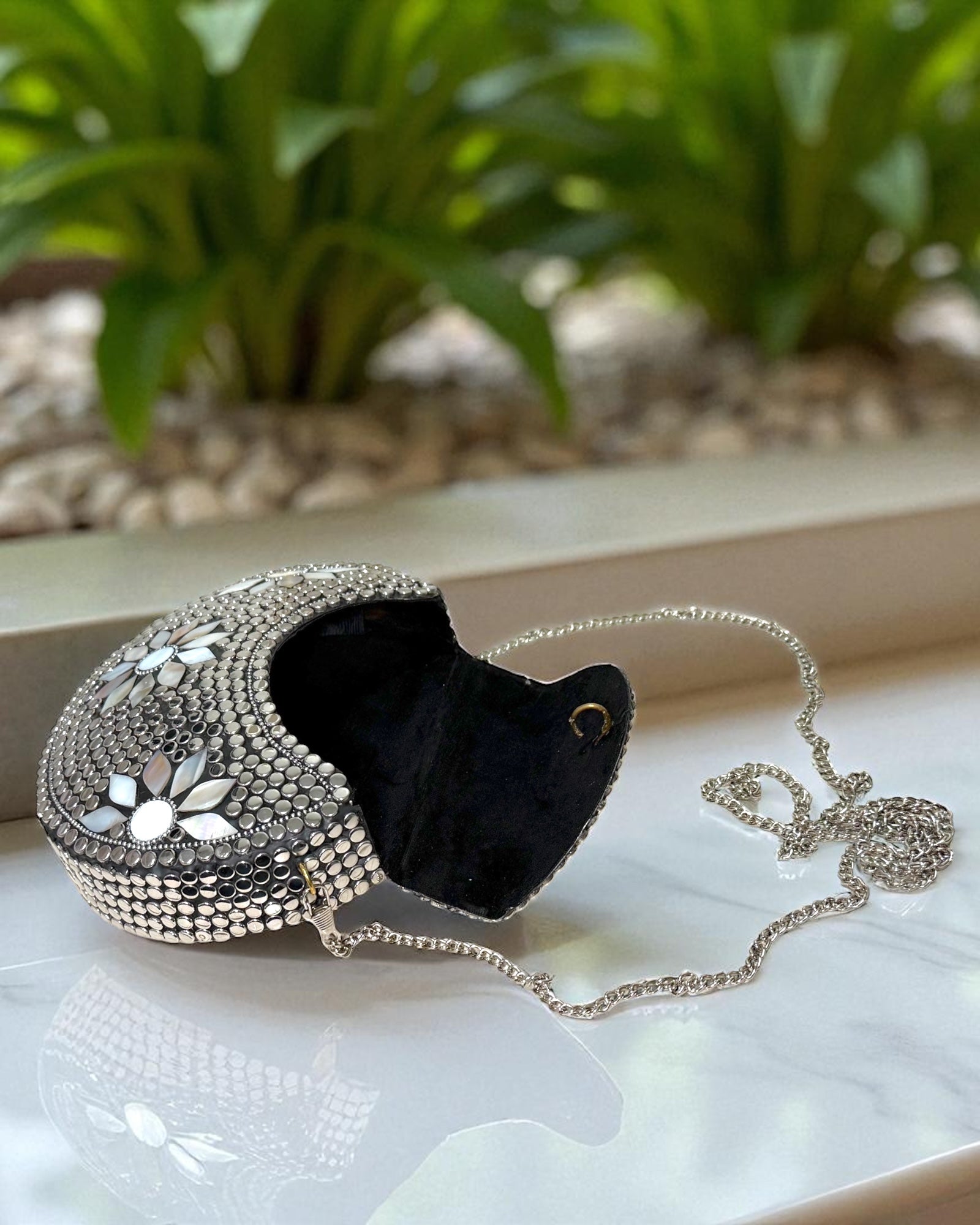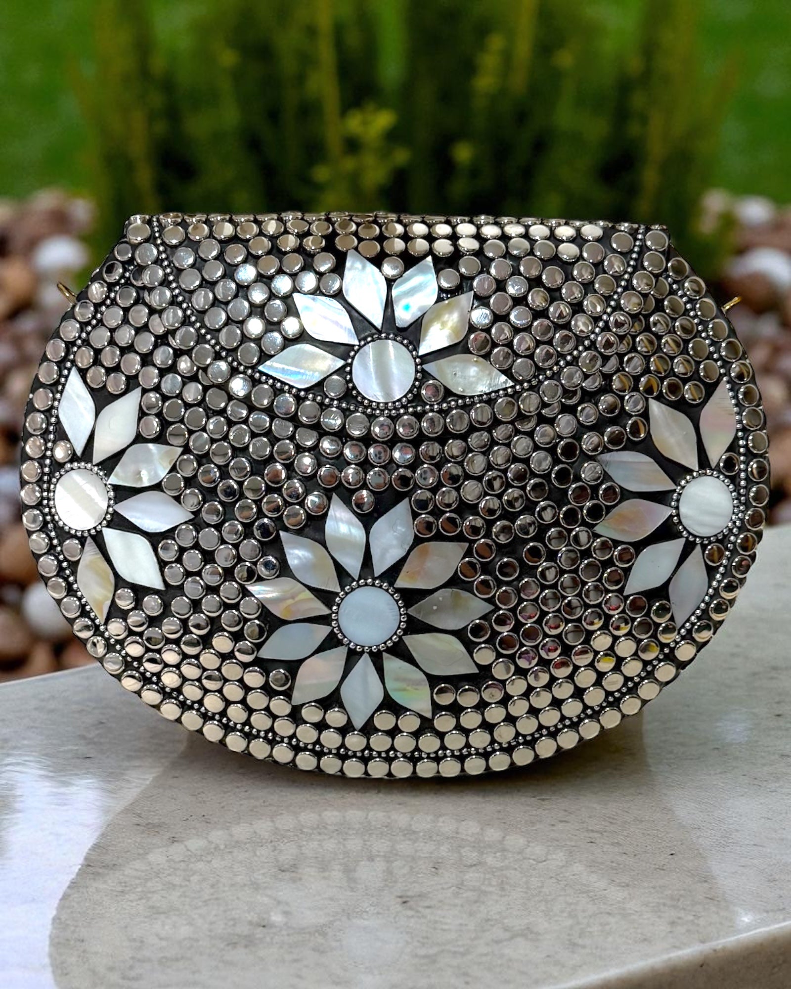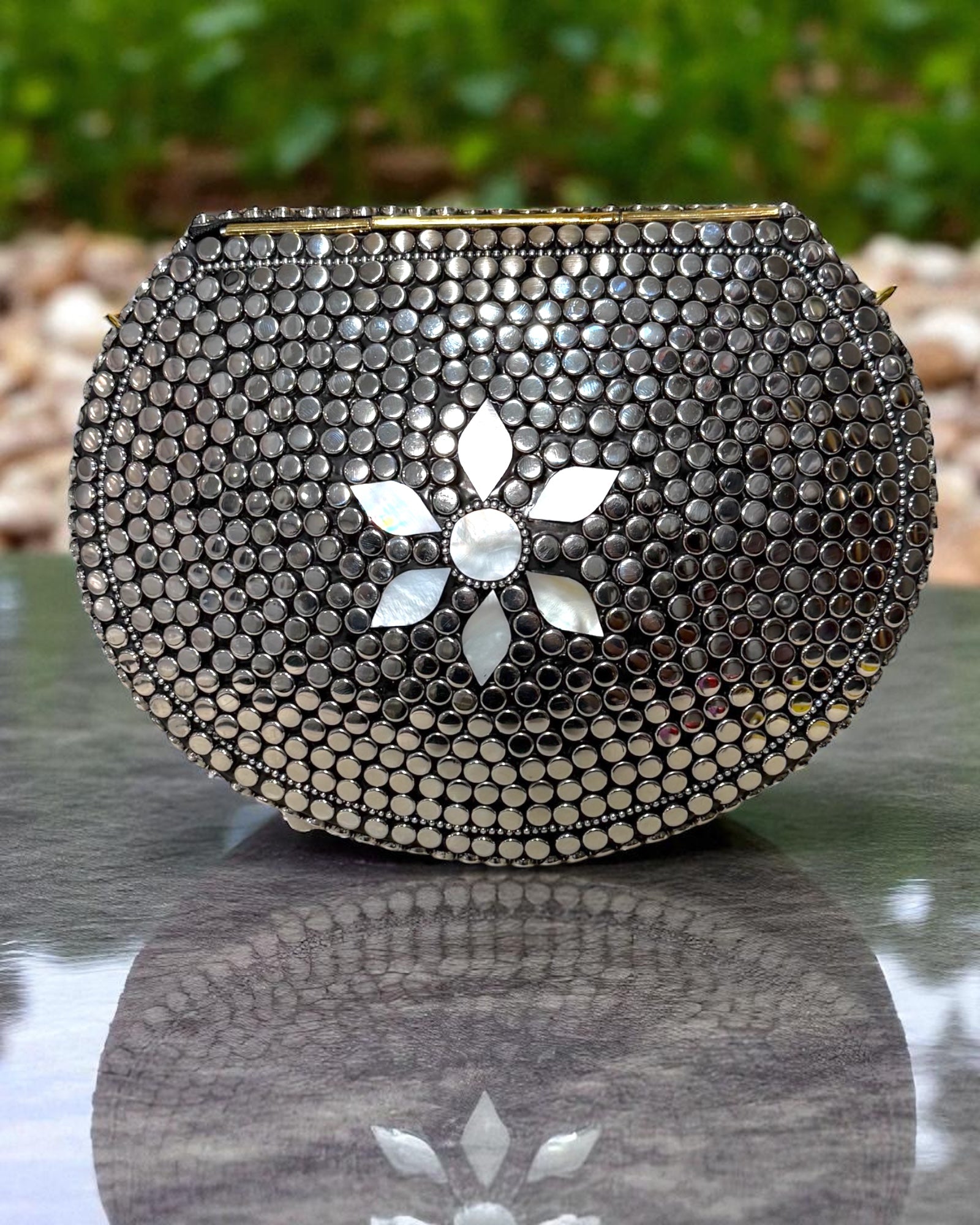 A stunning handcrafted piece adorned with brass detailing and opal inlay floral patterns. This clutch embodies timeless elegance and cultural artistry. It also comes with a detachable silver crossbody chain, giving you the versatility to style it as a shoulder bag or a handheld statement piece.✨