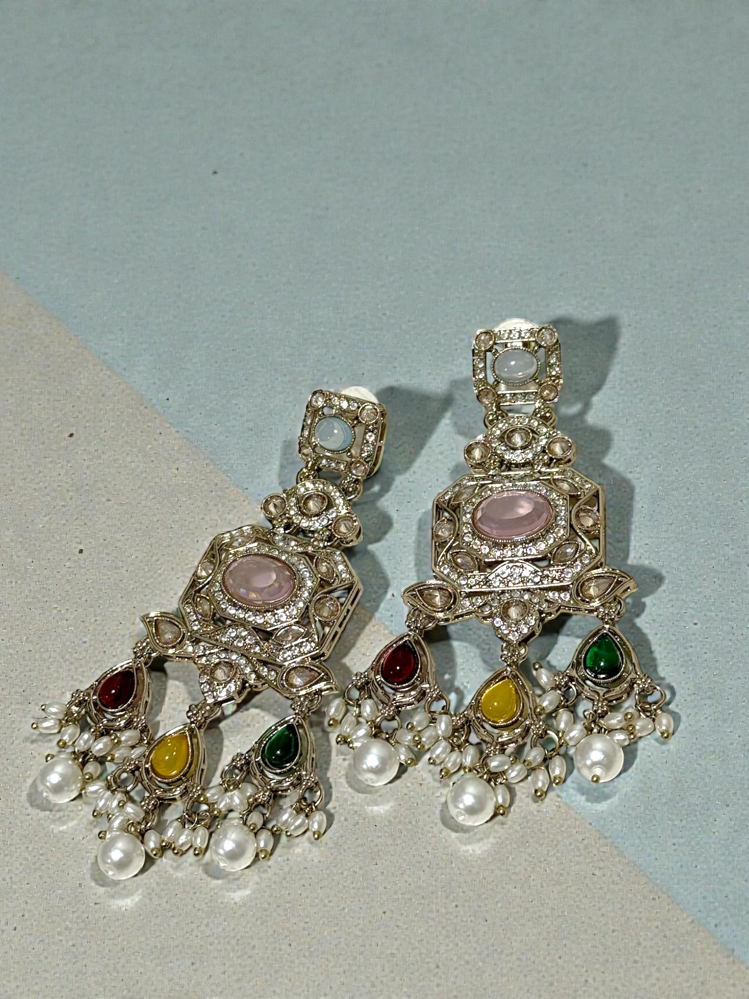 Archana अर्चना Polki Earrings in Multicolor - Pink Center Stone