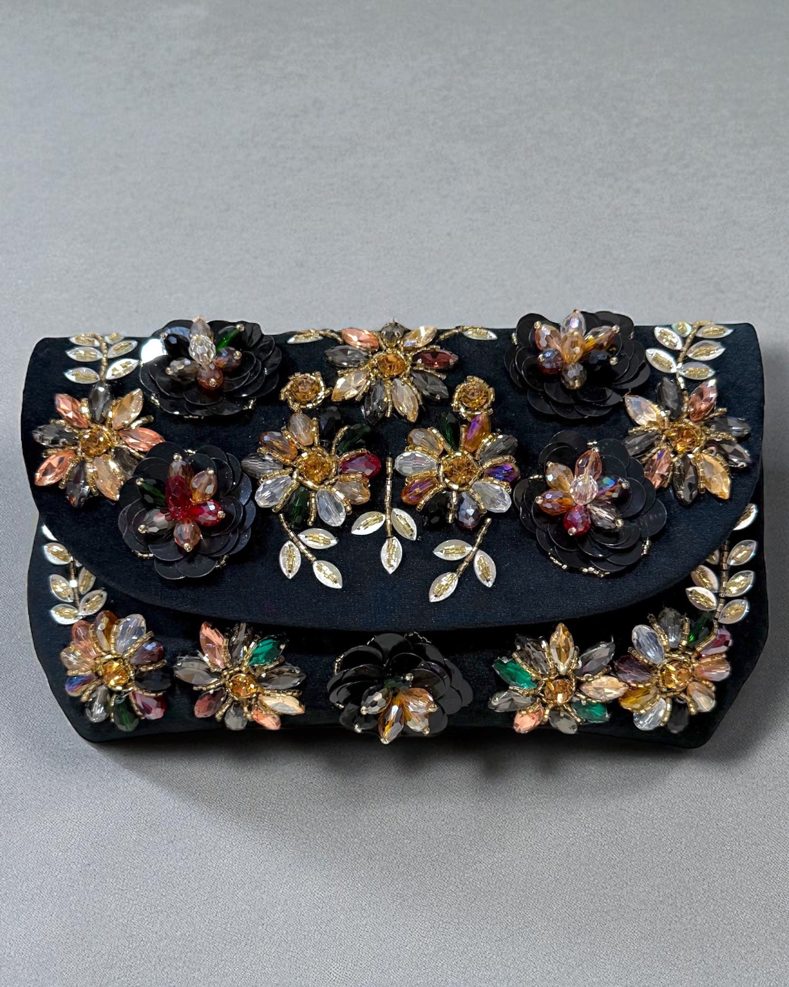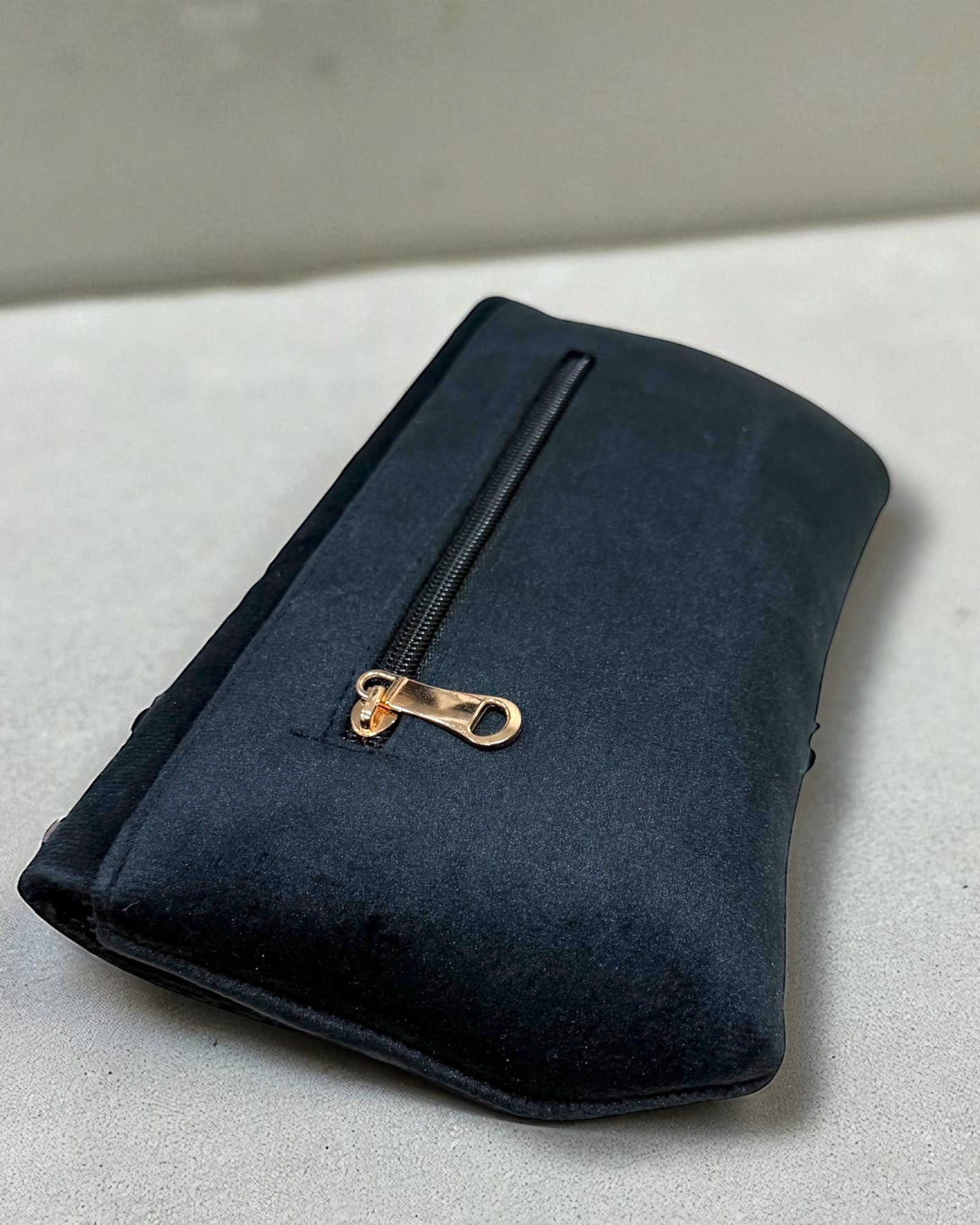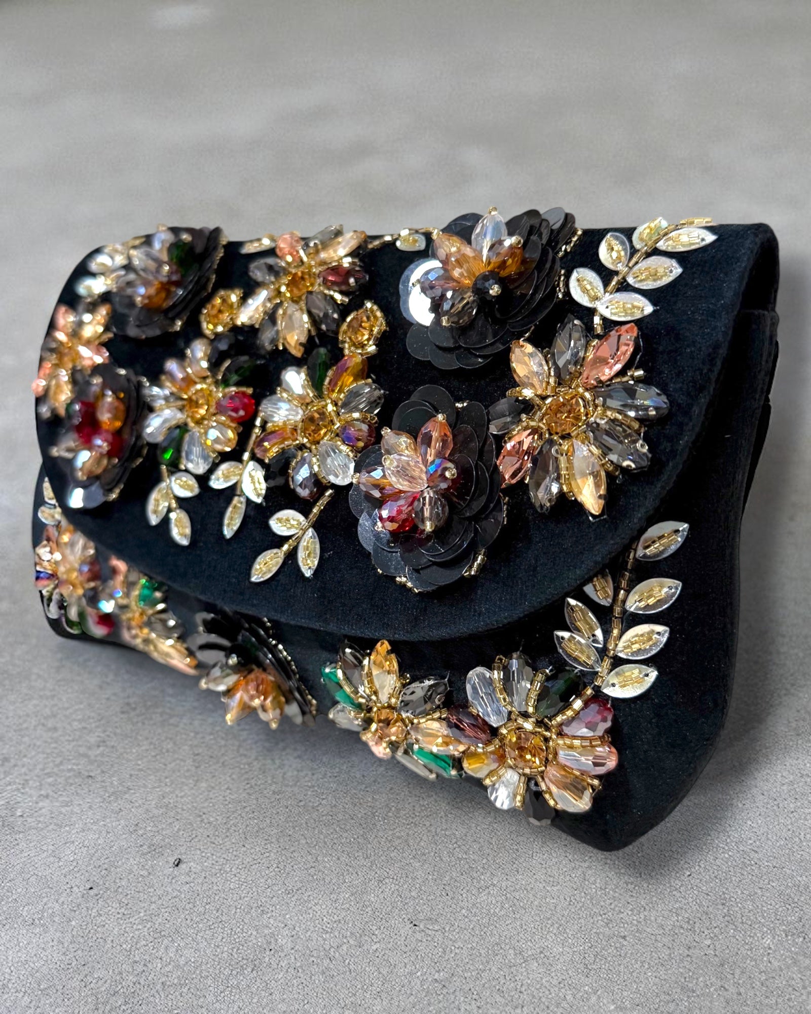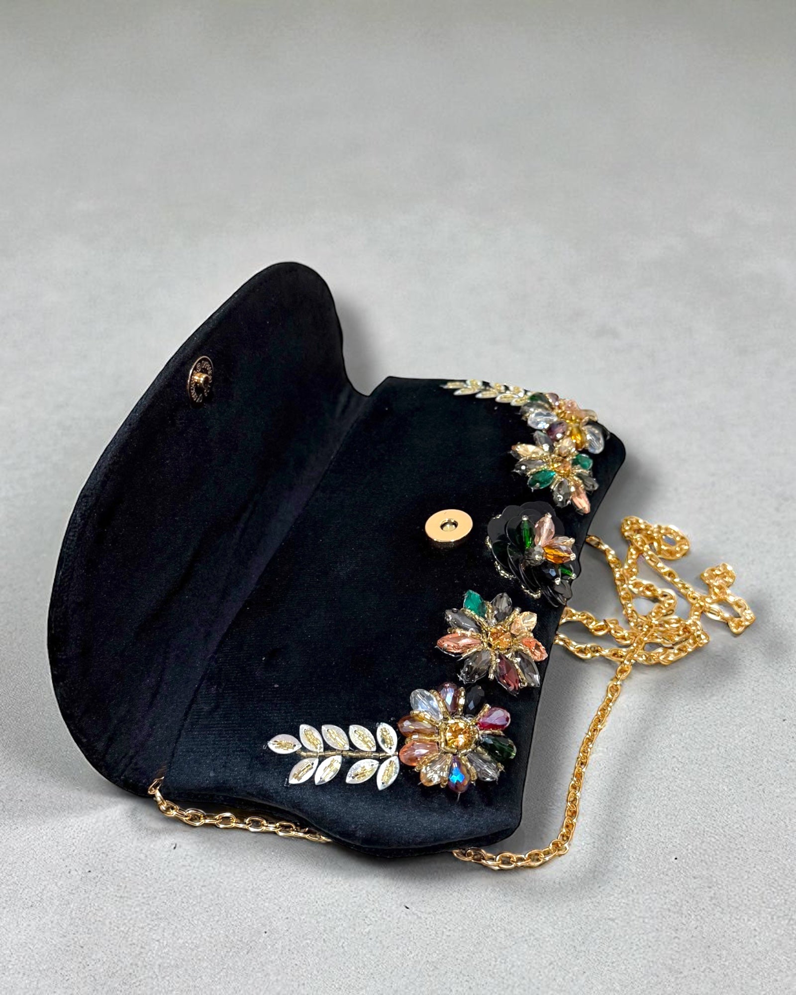 Graceful and refined, the Azra عَذْراء Floral Bag embodies purity and timeless charm. Crafted from soft, luxurious suede, its flap is adorned with intricate floral designs made from delicate beads and shimmering sequins, adding a touch of elegance to every detail. A practical back zipper and an interior zipper pocket keep your essentials secure, while the detachable crossbody chain offers versatile styling — wear it over the shoulder for a chic day look or as a clutch for evening elegance. Perfect for weddings, festive gatherings, and special occasions, Azra is where sophistication meets subtle glamour.