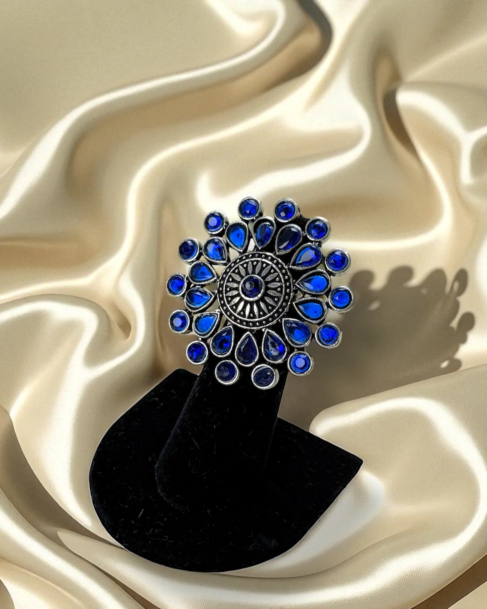 Inspired by the brilliance of a night sky, the Sitara सितारा ring is a radiant statement piece crafted in oxidized metal and set with dazzling, deep-toned stones. The bold circular design, framed by teardrop and round accents, evokes the shape of a guiding star. With an adjustable band for a comfortable fit, this ring effortlessly blends vintage charm with modern edge — perfect for festive occasions or everyday boldness.✨