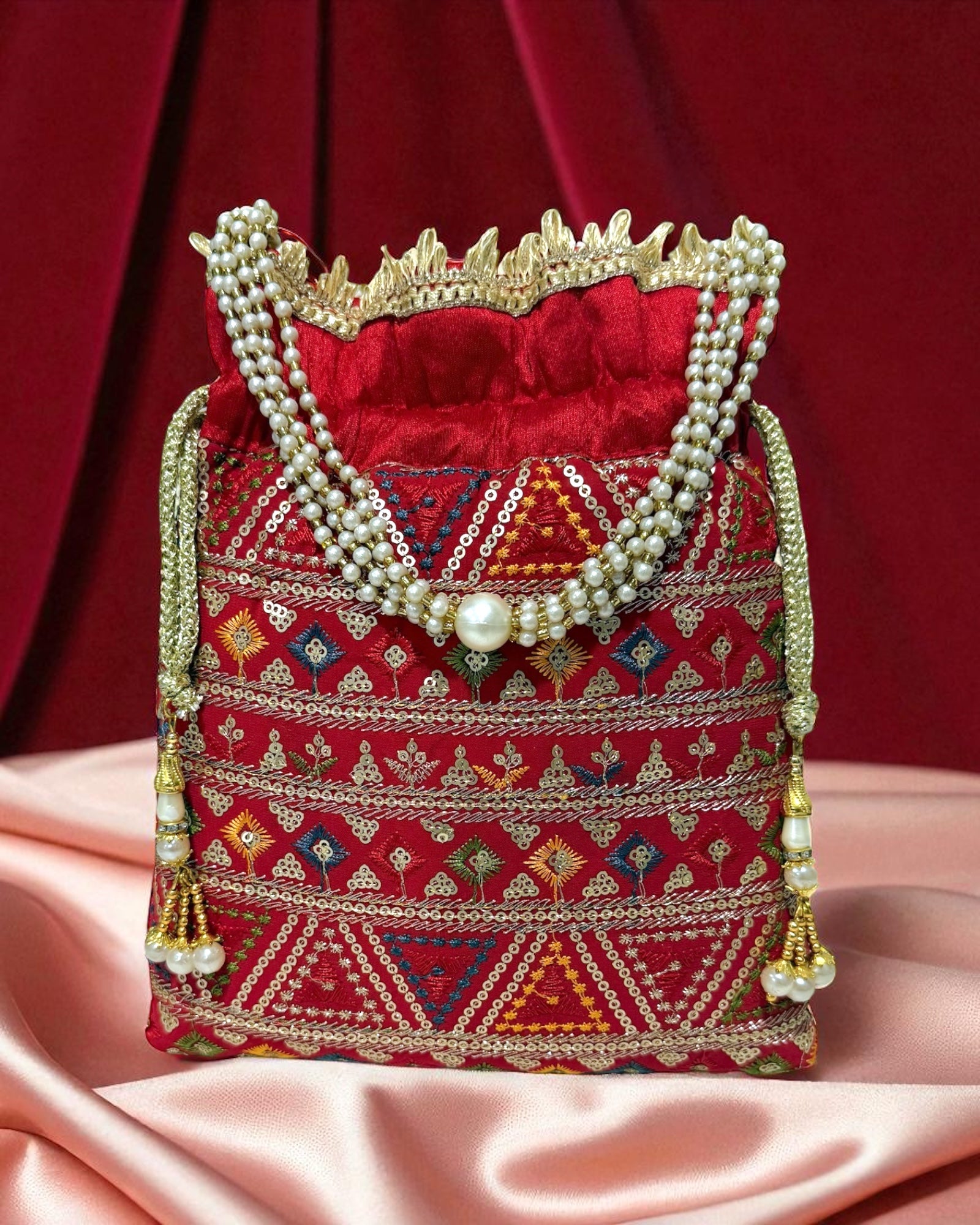 The Dalia داليا Embroidered Potli Bag is a graceful statement piece designed with intricate embroidery on both sides, accented by delicate champagne gold buttons. Two pearl tassels allow the bag to cinch beautifully at the top, combining style with function. A handle made of pearls and gold beads adds a touch of luxury and comfort. Finished with elegant gotta lace at the top, this potli is perfect for weddings, festive celebrations, or adding charm to any special occasion.✨