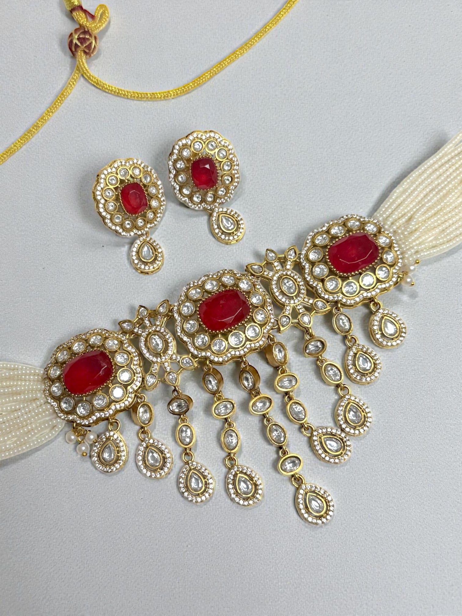 Ebtihal ابتهال Gold Plated Tyaani Kundan Choker Set with Doublet Stone in Red