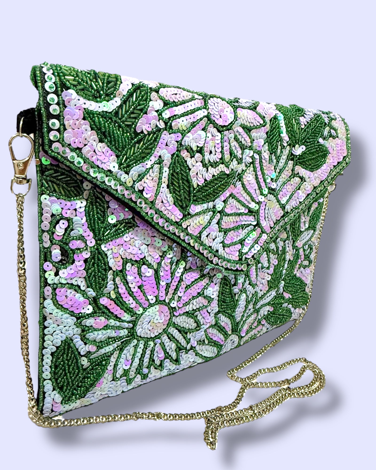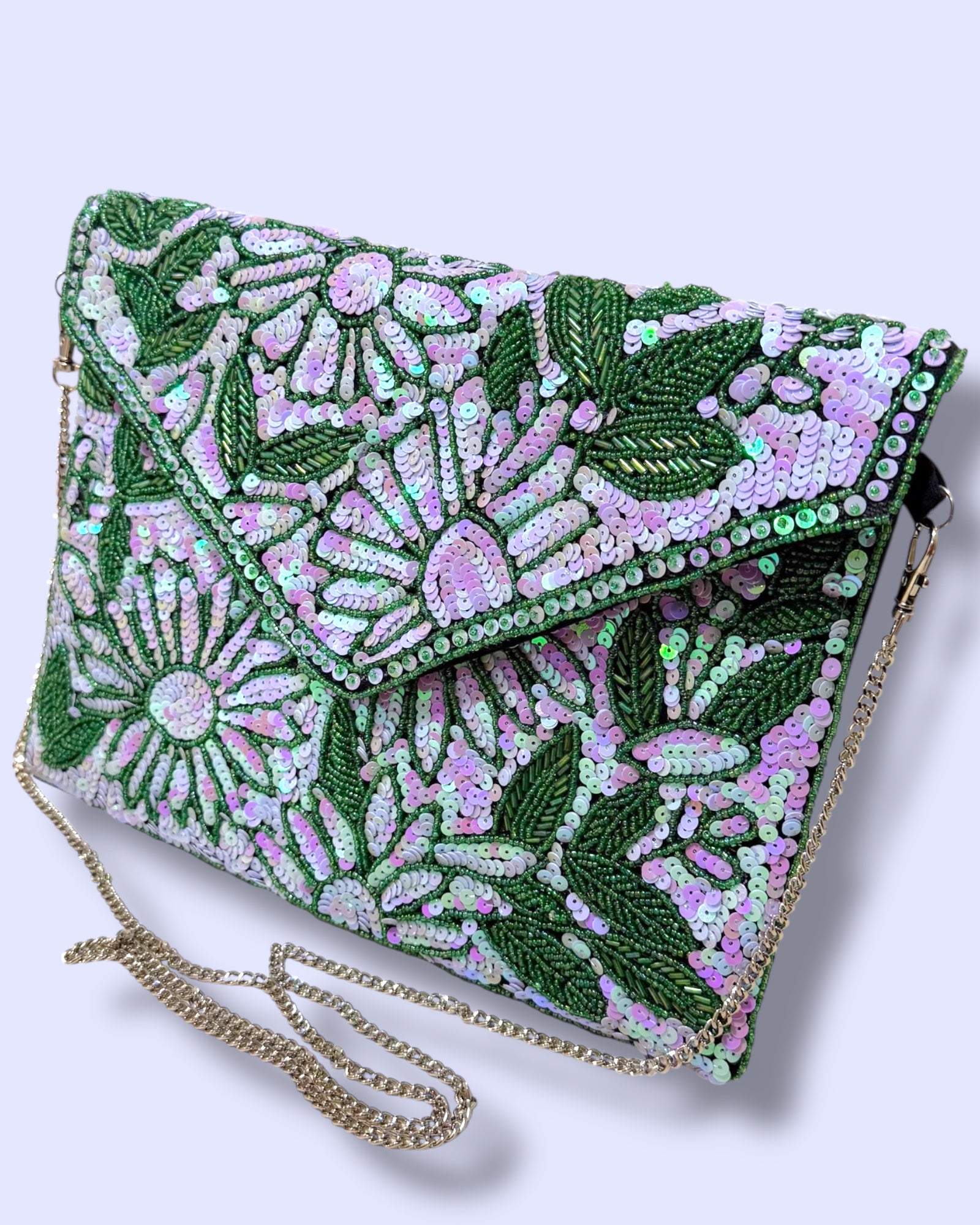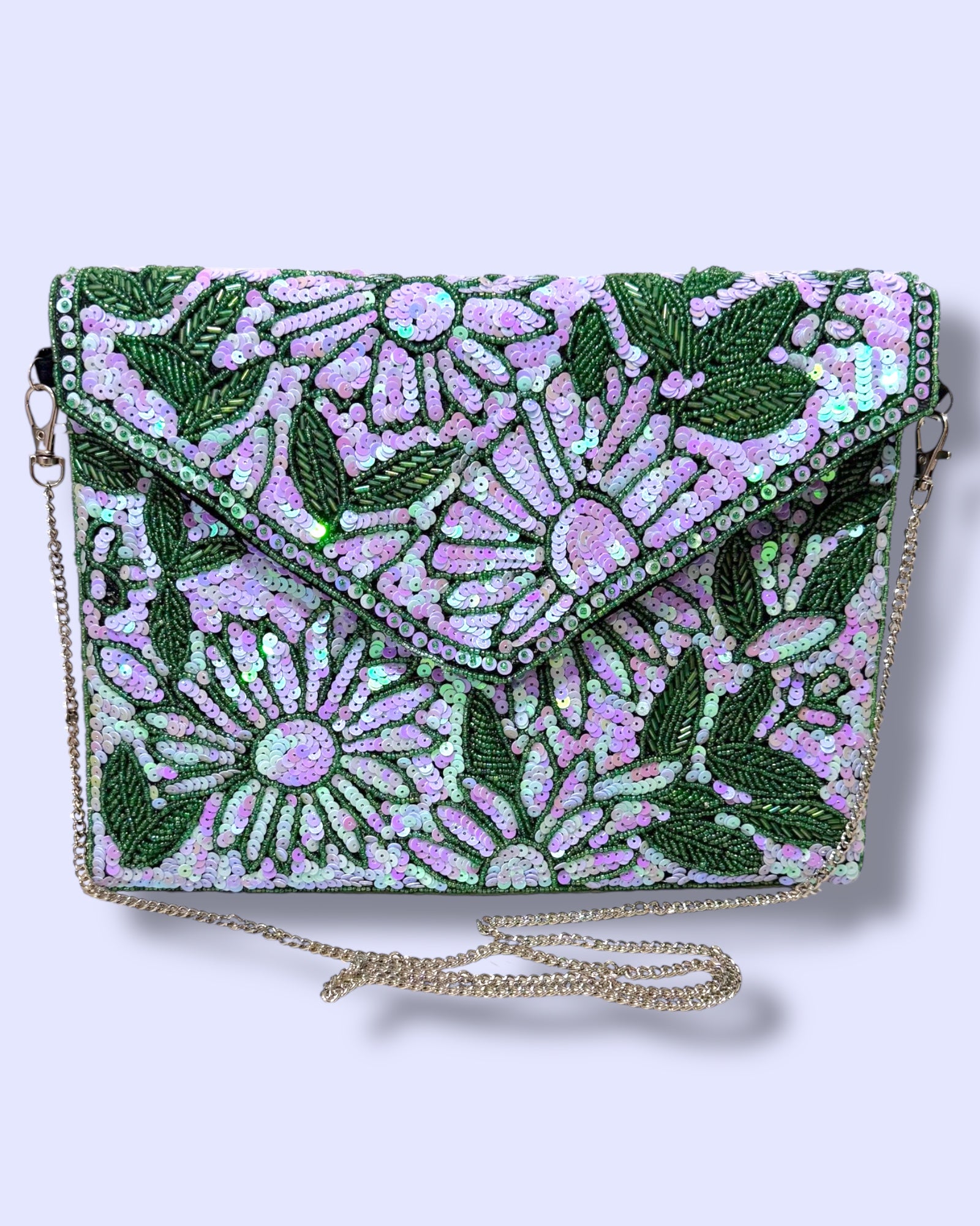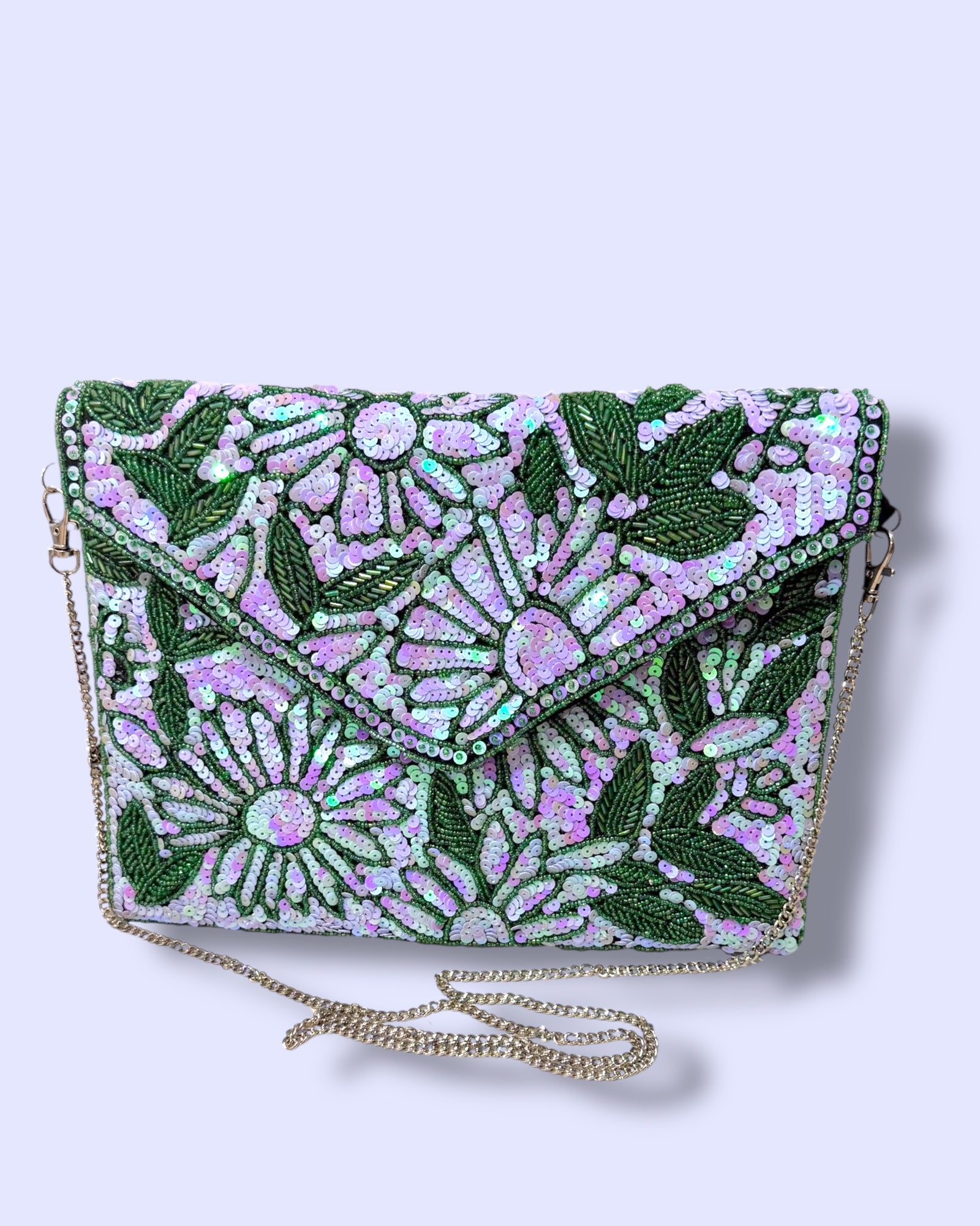 A dazzling hand-beaded clutch designed with shimmering sequins in soft lilac and green tones. The floral patterns sparkle beautifully against the leafy detailing, making it an elegant statement piece. Its envelope style adds a chic touch, perfect for weddings, parties, or special evenings. It comes with a crossbody chain.