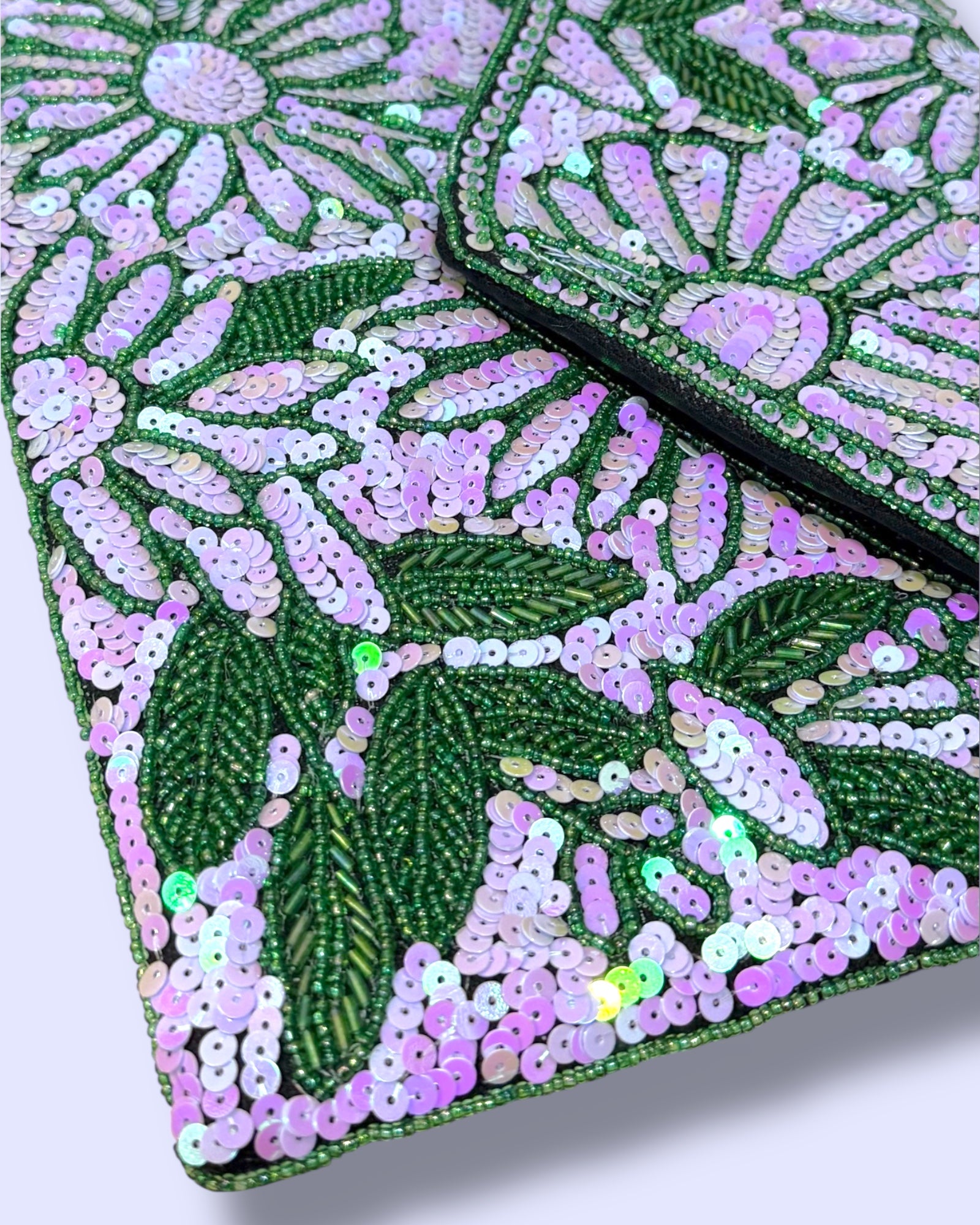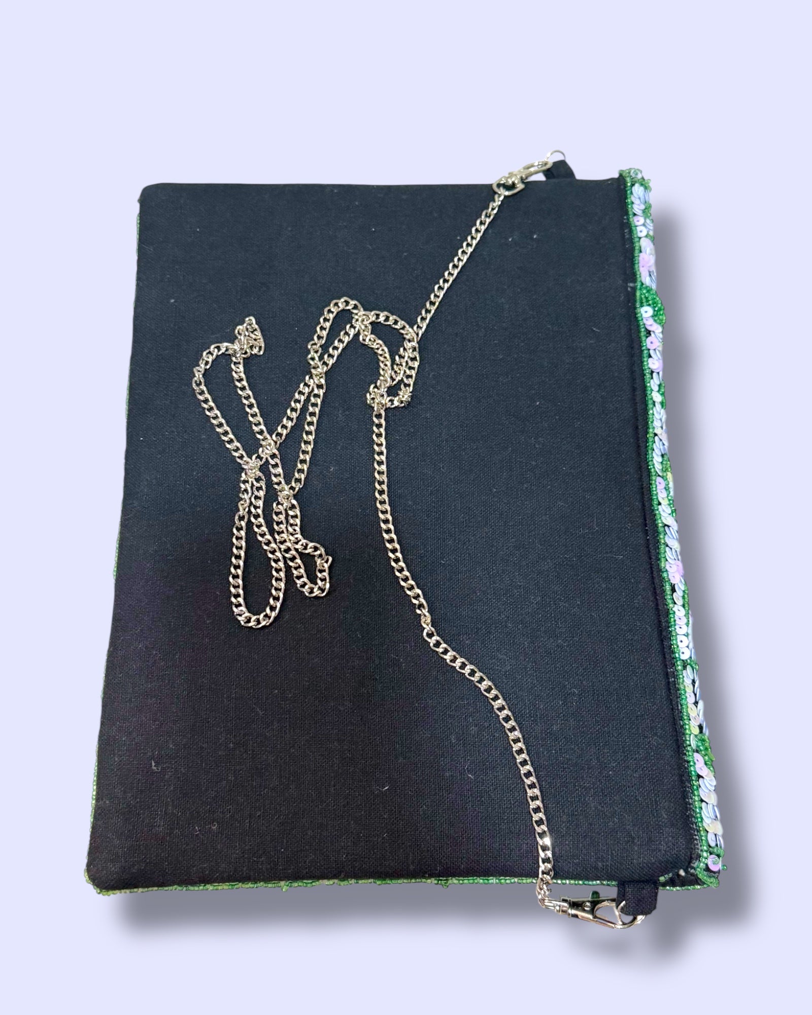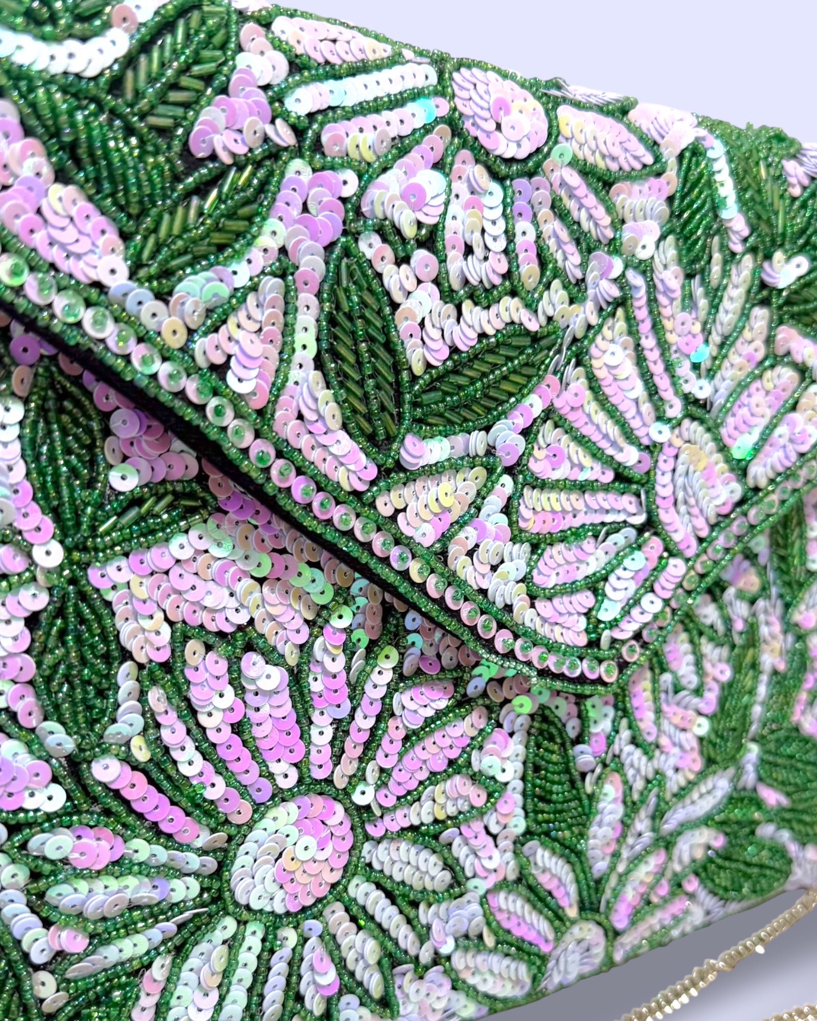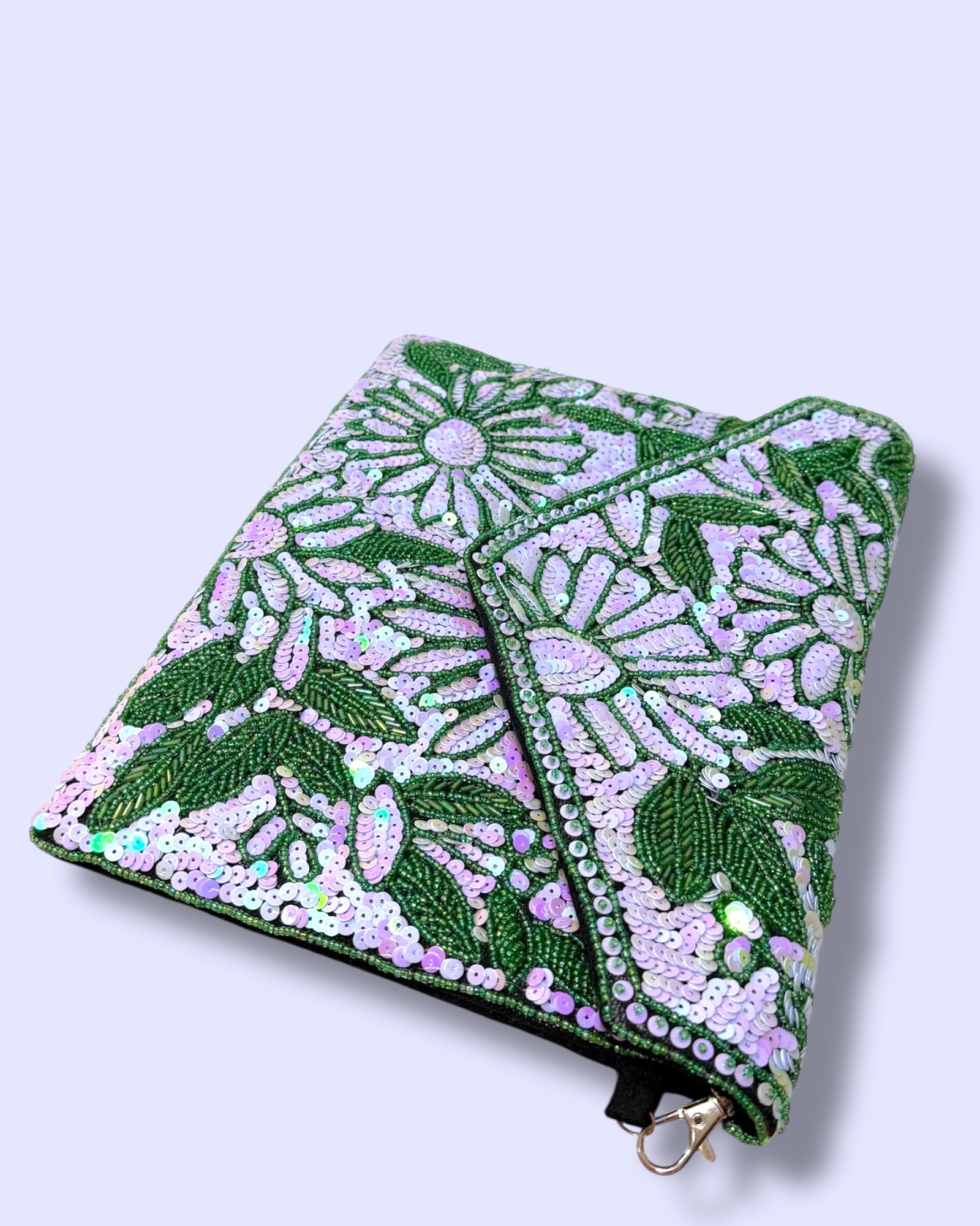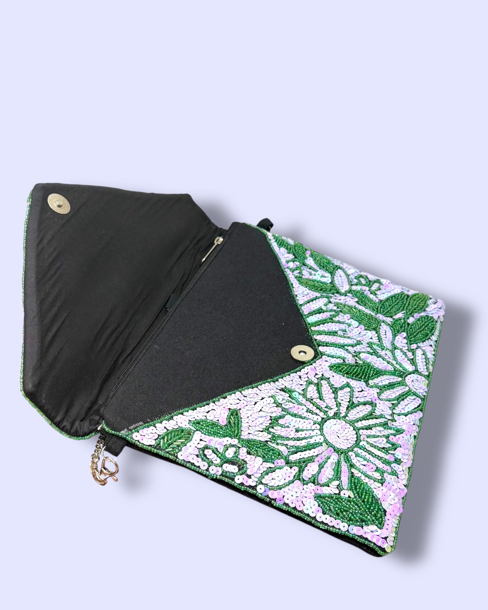 A dazzling hand-beaded clutch designed with shimmering sequins in soft lilac and green tones. The floral patterns sparkle beautifully against the leafy detailing, making it an elegant statement piece. Its envelope style adds a chic touch, perfect for weddings, parties, or special evenings. It comes with a crossbody chain.