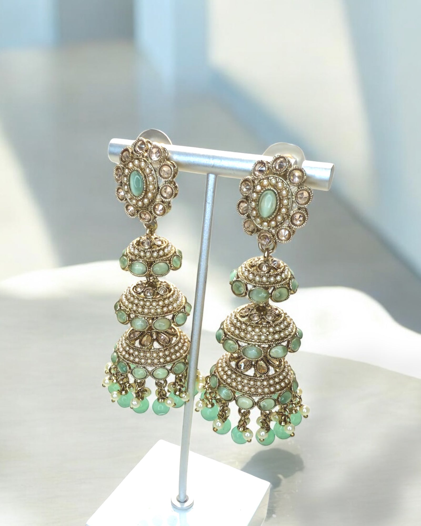 Huda هدى Triple-Layered Polki Jhumkay in Mint