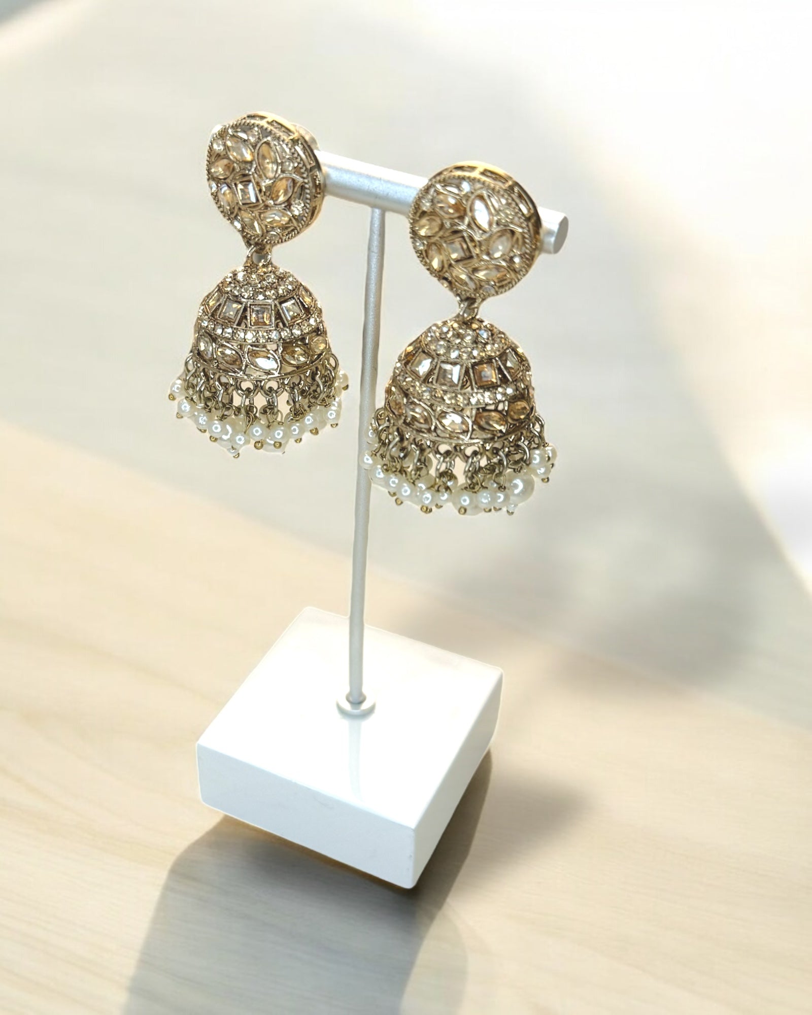 Elegant and full of tradition, Iman, meaning faith, reflects classic beauty in its purest form. These traditional gold stone Jhumkay are crafted with intricate detail and finished with white pearls that dangle softly from the base, adding gentle movement and grace.✨