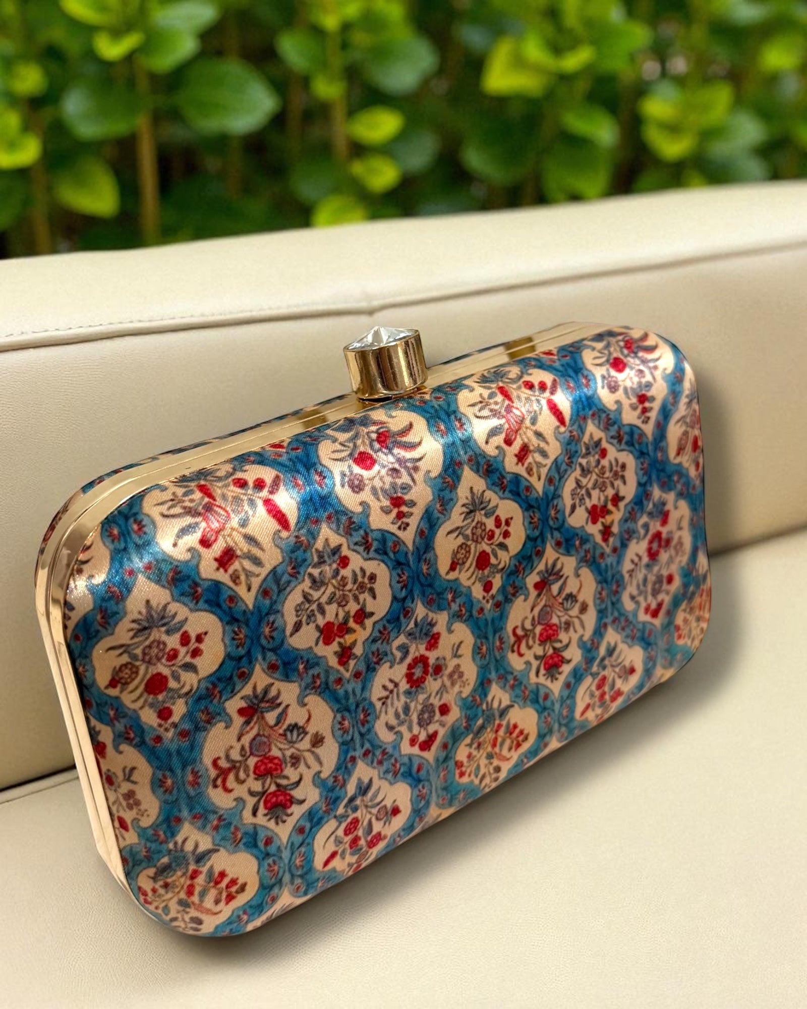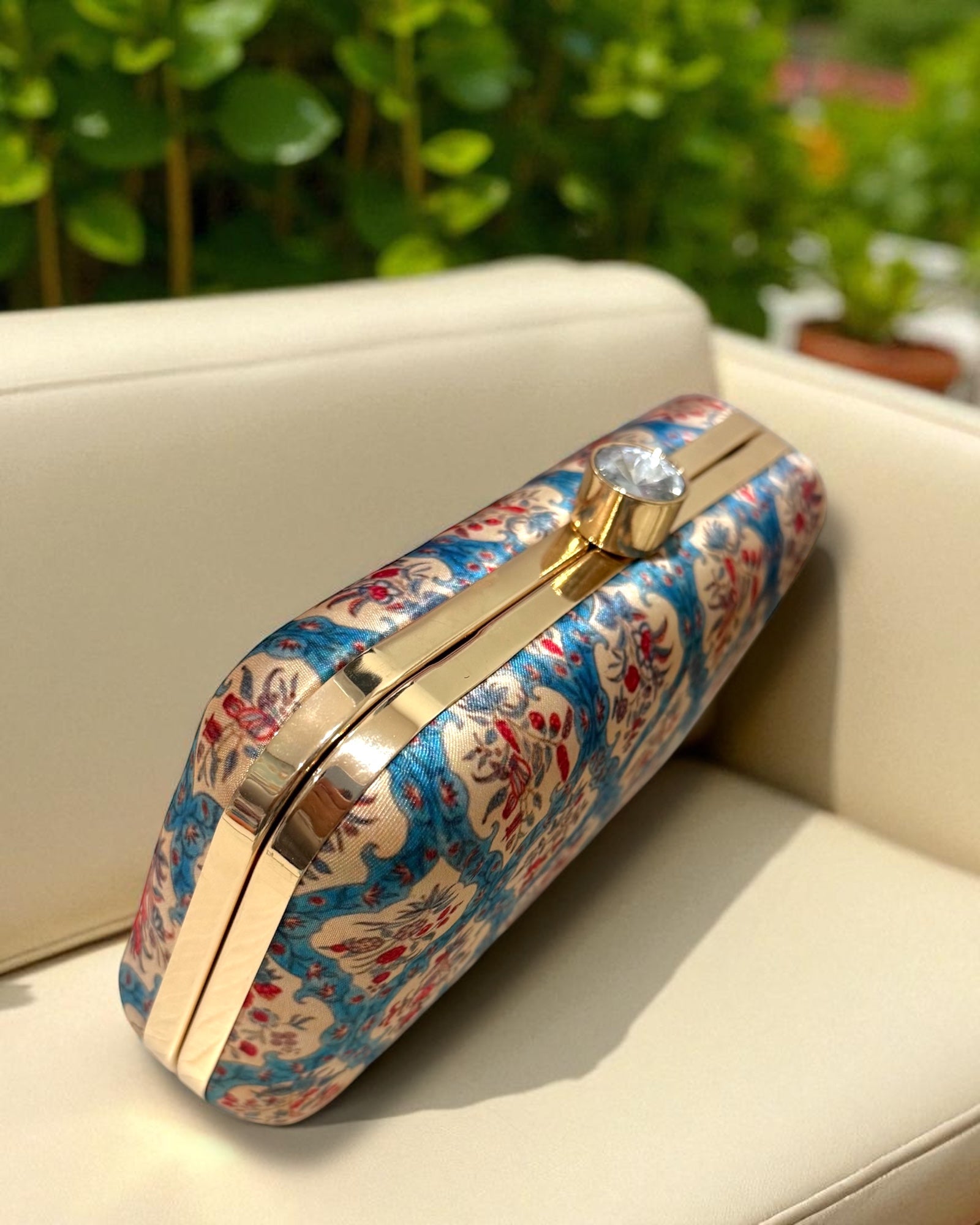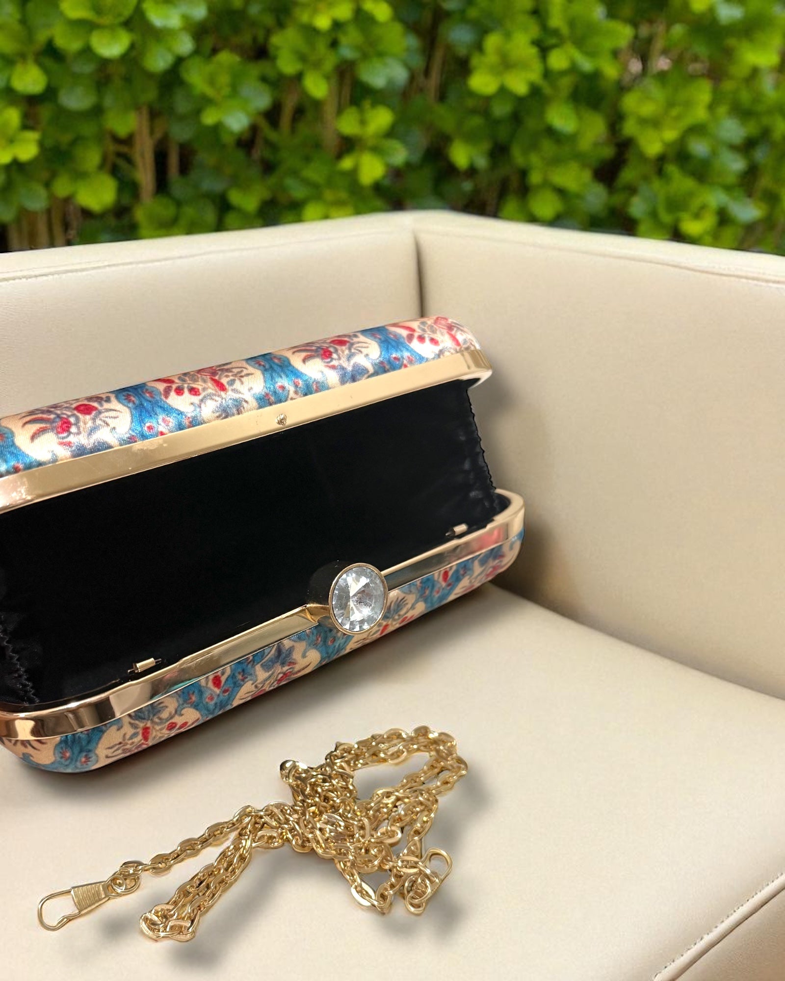 Featuring a gold base adorned with a floral print in elegant shades of cream, red, and blue, this clutch offers a silky, soft-to-the-touch finish. The top is embellished with a sparkling diamond-style button, adding a hint of glamour. Inside, a smooth black satin lining enhances its luxurious feel, and it comes with a detachable gold crossbody chain for versatile styling.