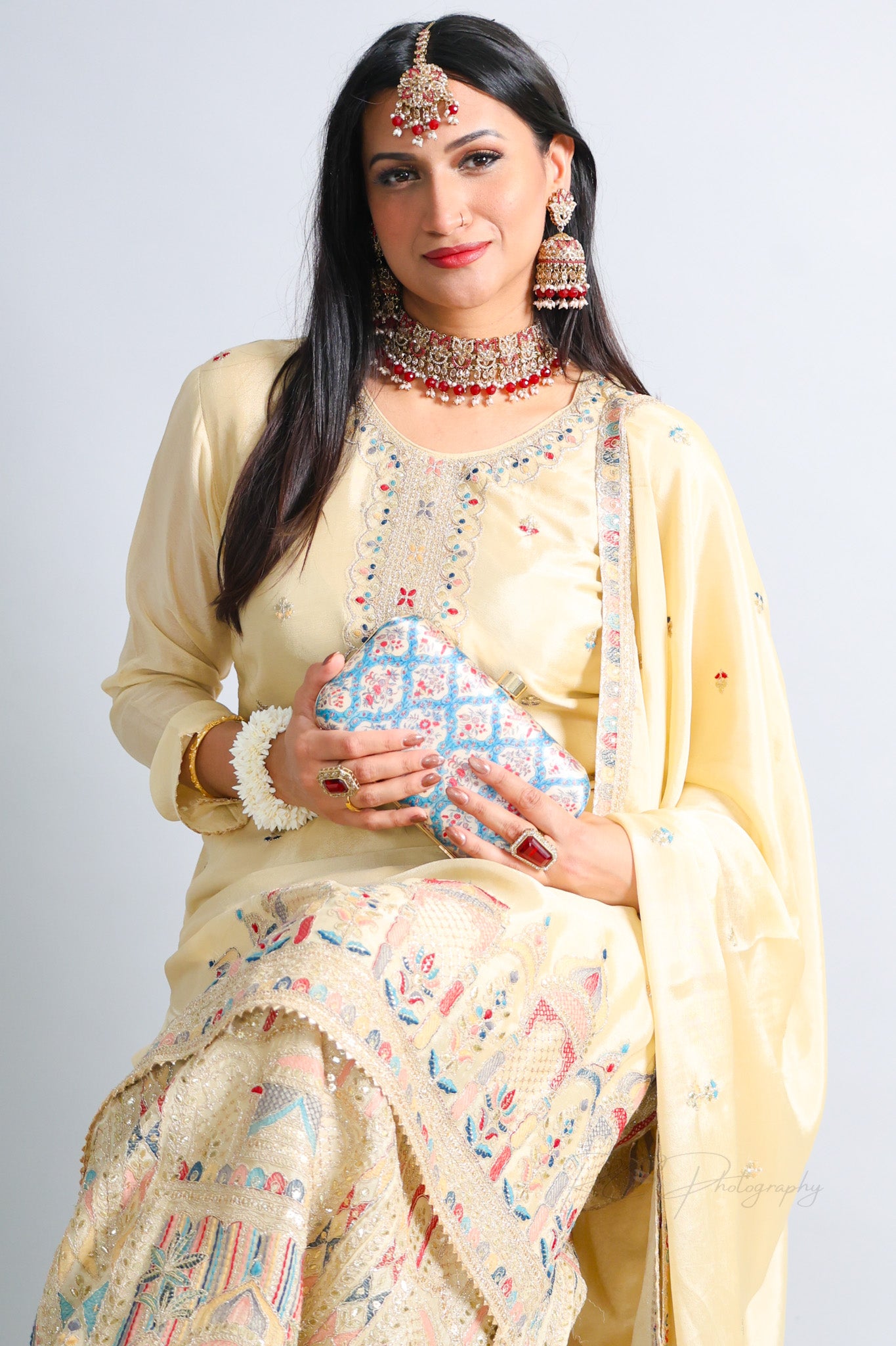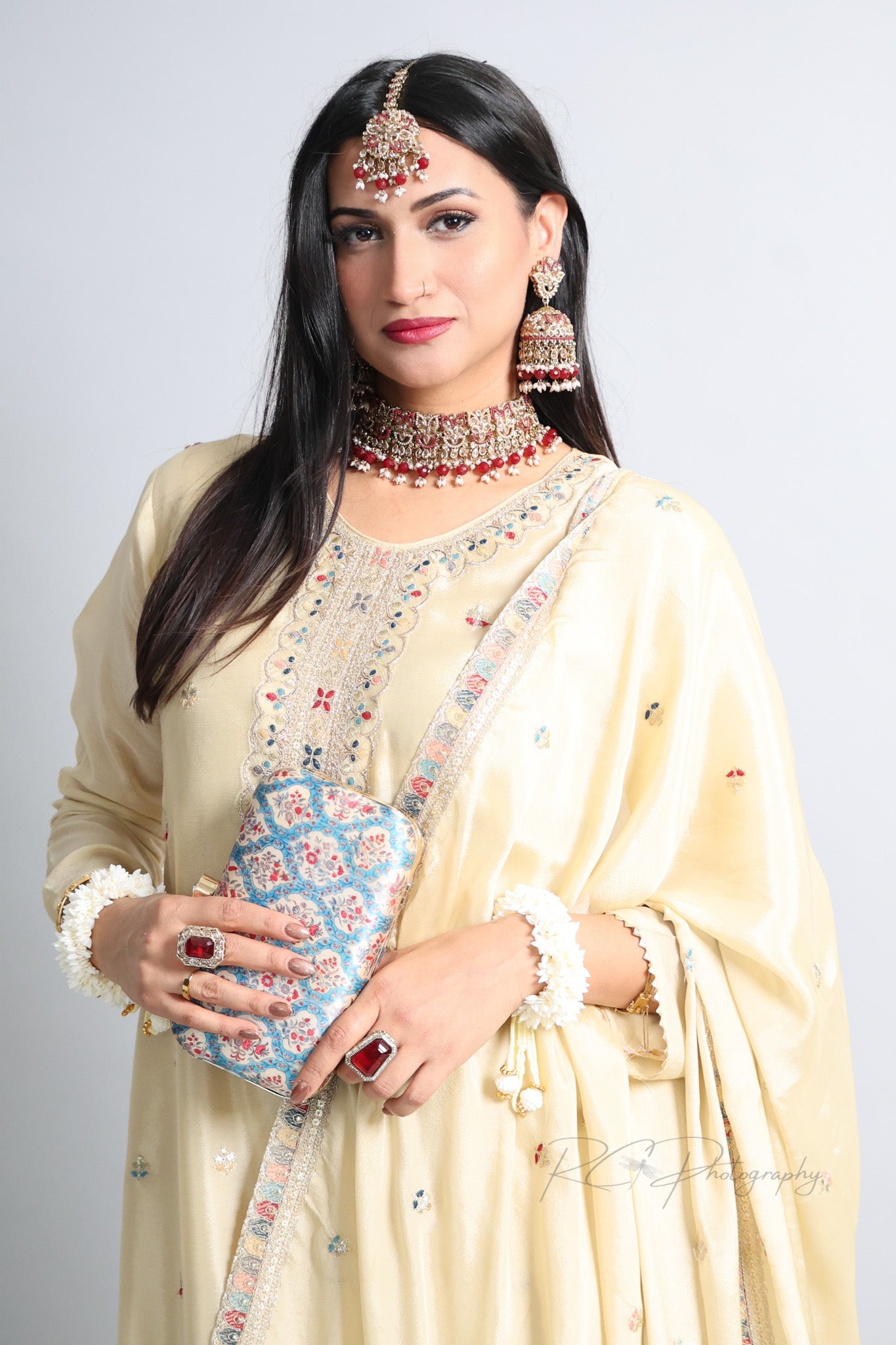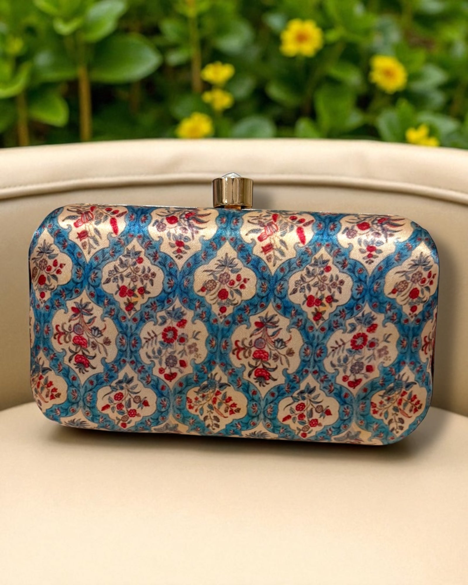 Featuring a gold base adorned with a floral print in elegant shades of cream, red, and blue, this clutch offers a silky, soft-to-the-touch finish. The top is embellished with a sparkling diamond-style button, adding a hint of glamour. Inside, a smooth black satin lining enhances its luxurious feel, and it comes with a detachable gold crossbody chain for versatile styling.