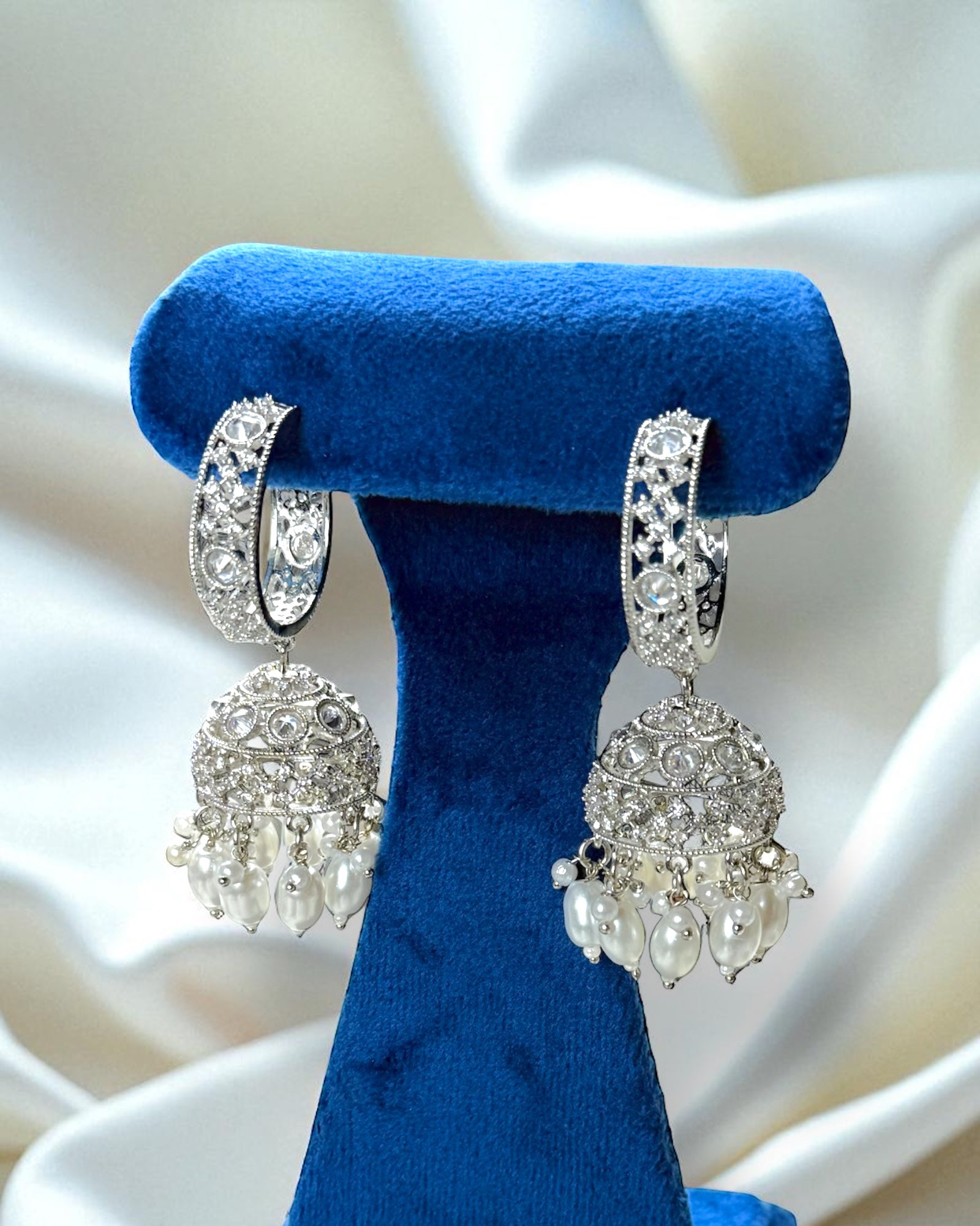 Elevate your elegance with the Kavya काव्या Polki Jhumkay Hoops — a graceful blend of tradition and sparkle. These earrings feature intricately detailed hoops encrusted with high-quality Polki stones, leading into a dome-shaped jhumka adorned with delicate pearls or microbeads. Lightweight yet statement-making, they add timeless charm to any outfit — whether you’re dressing up for a celebration or adding a touch of glamour to everyday wear.✨