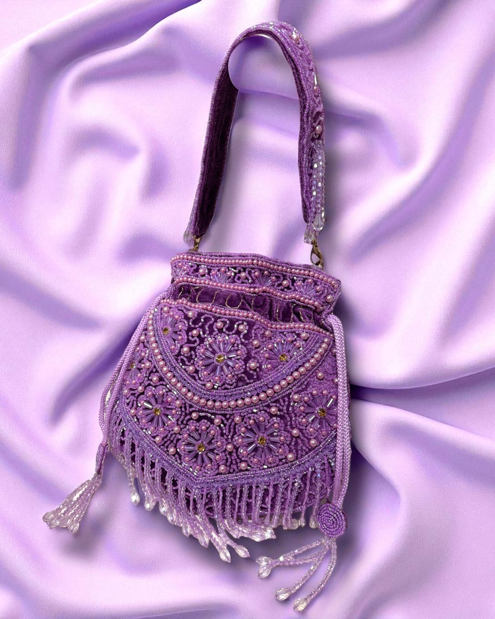 The Leyla ليلى Dream Bag in Purple is a stunning purple accessory that effortlessly blends elegance and charm. Crafted from rich purple velvet fabric, it features shimmering beads that resemble delicate glass, paired beautifully with soft lavender pearls for a touch of sparkle. The bag comes with a detachable handle, giving you versatile styling options. Inside, you’ll find a luxurious purple silky lining for a smooth finish. Plus, the playful tassels on the sides can be pulled to cinch the top, adding both function and flair to this dreamy piece. Perfect for adding a pop of color and shine to any outfit!
