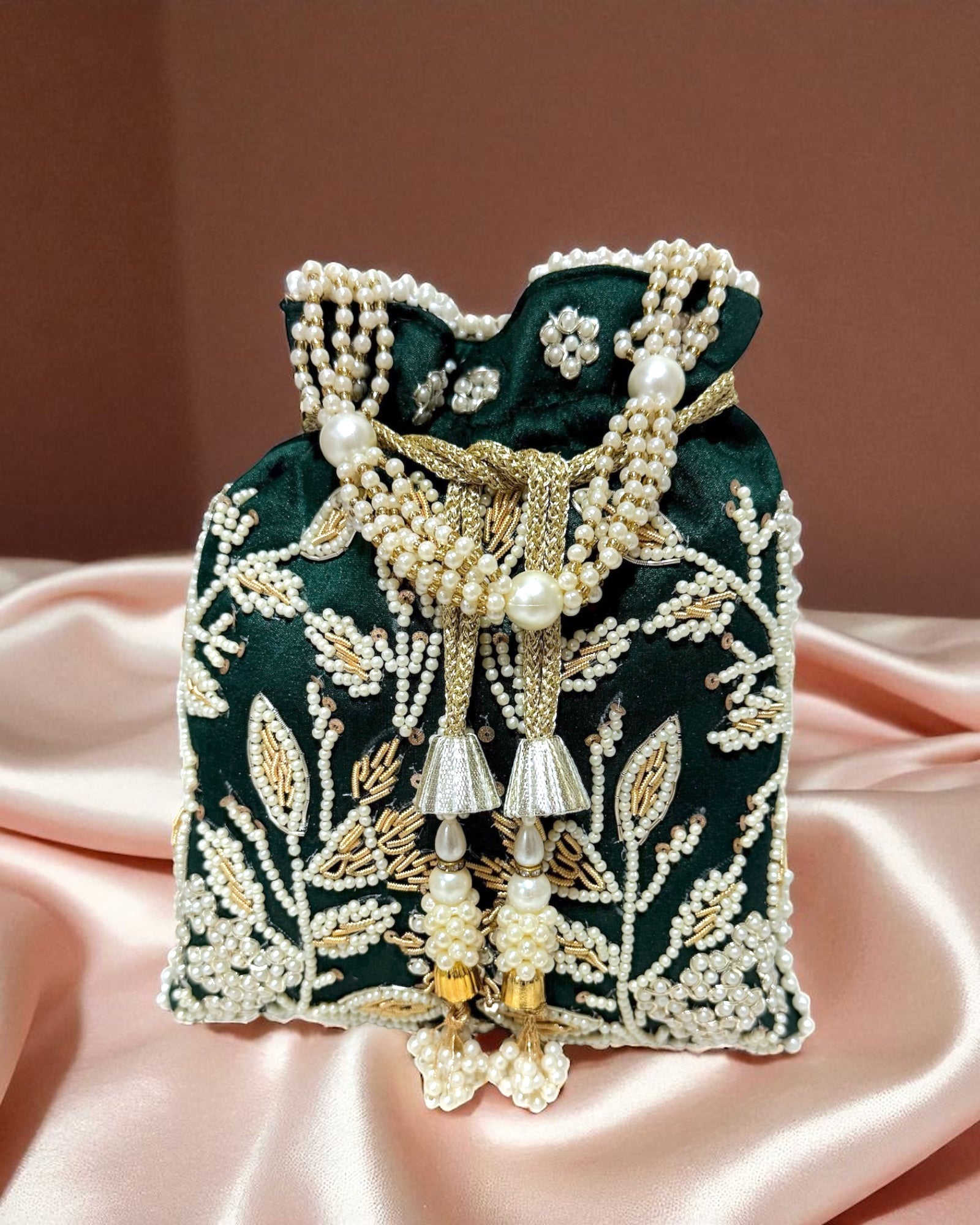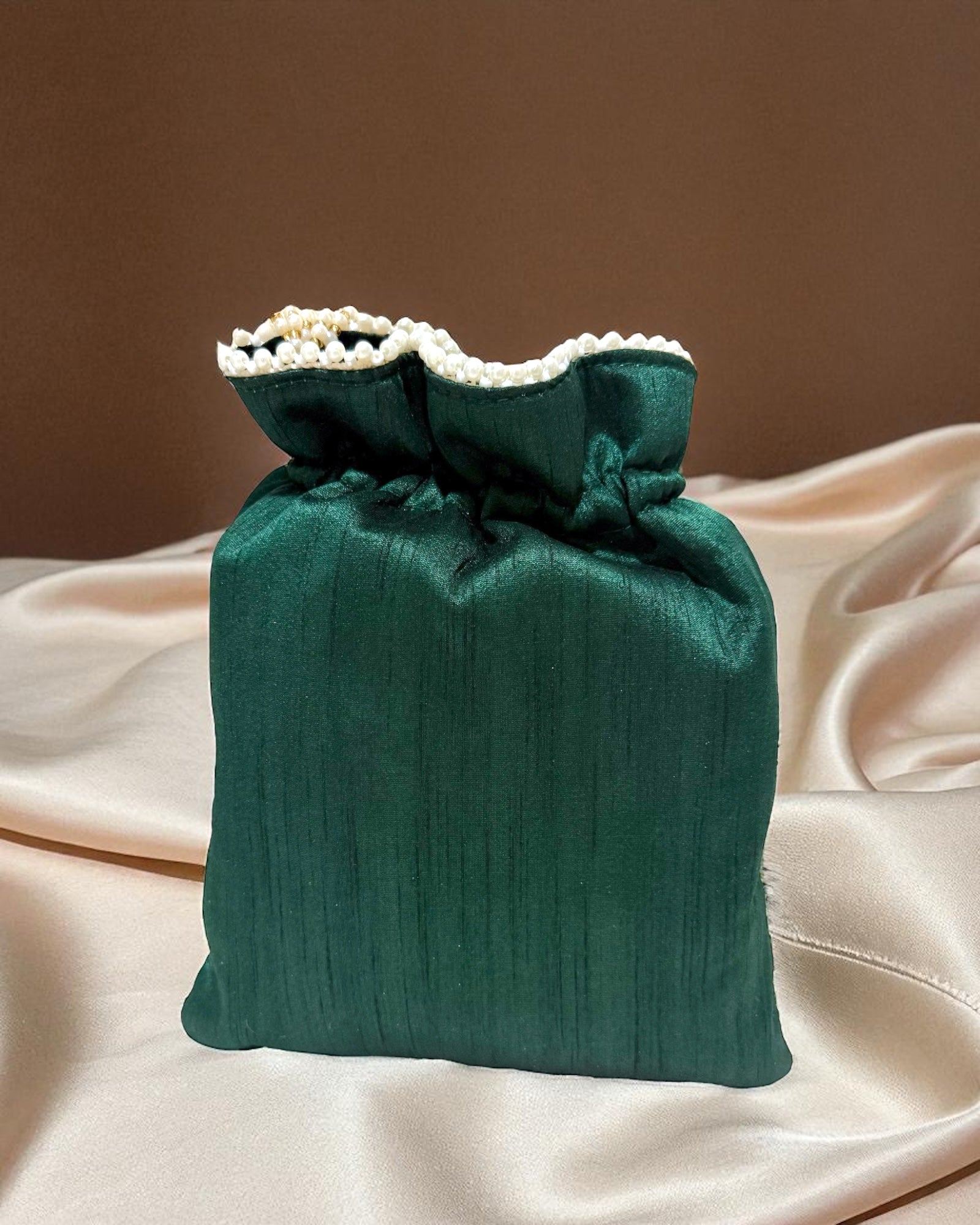 The Munira منيرة Potli Bag is crafted from smooth satin for a luxurious feel. Its front features intricate pearl sequence and delicate handwork, while the back remains a sleek, plain satin finish. Pearls line the perimeter, with elegant pearl tassels on each side to cinch the bag beautifully. A pearl and gold bead handle completes this timeless piece, perfect for weddings, parties, and festive occasions.✨