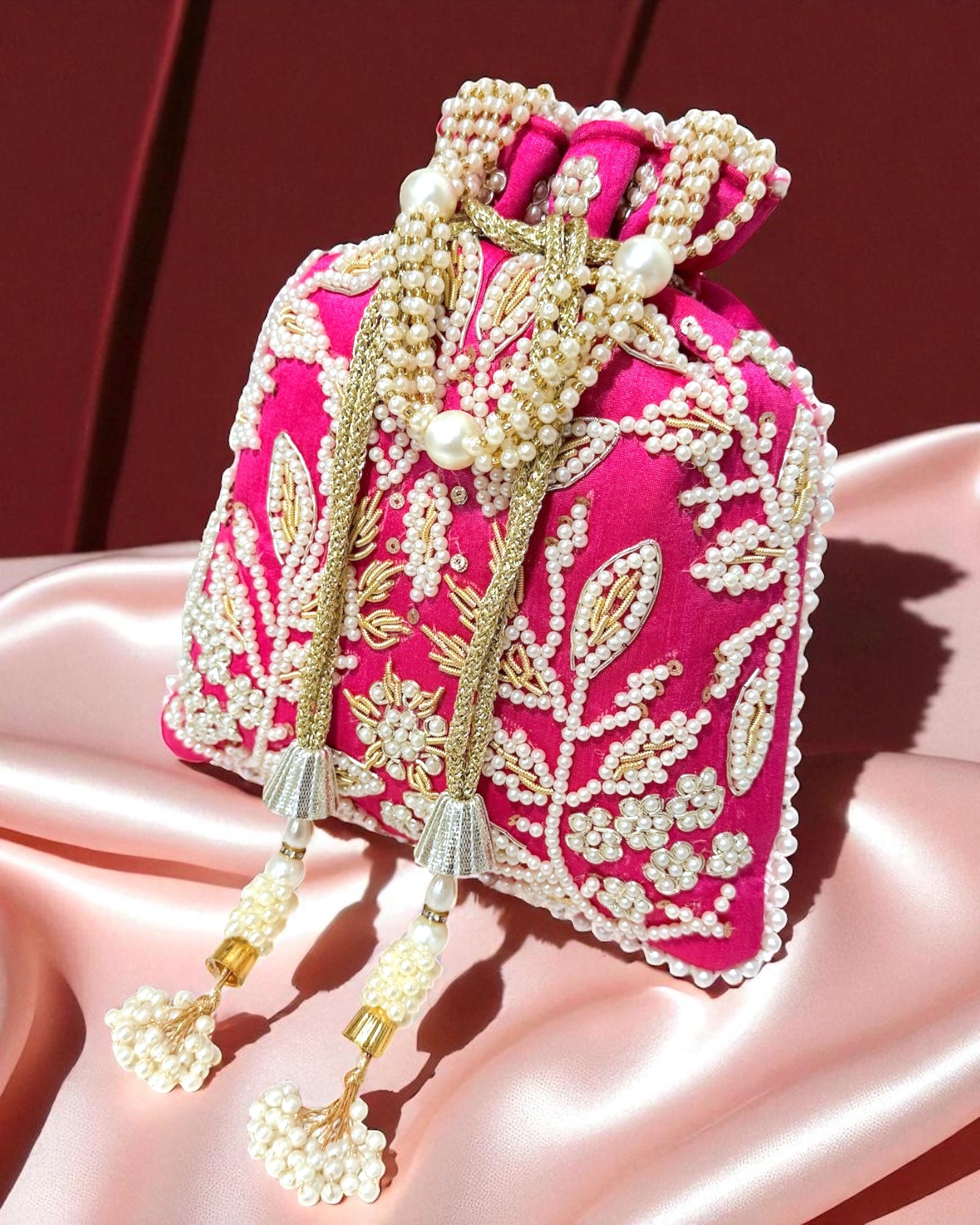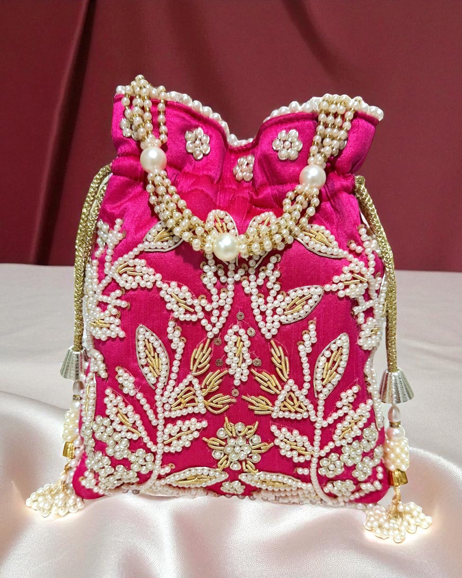The Munira منيرة Potli Bag is crafted from smooth satin for a luxurious feel. Its front features intricate pearl sequence and delicate handwork, while the back remains a sleek, plain satin finish. Pearls line the perimeter, with elegant pearl tassels on each side to cinch the bag beautifully. A pearl and gold bead handle completes this timeless piece, perfect for weddings, parties, and festive occasions.✨