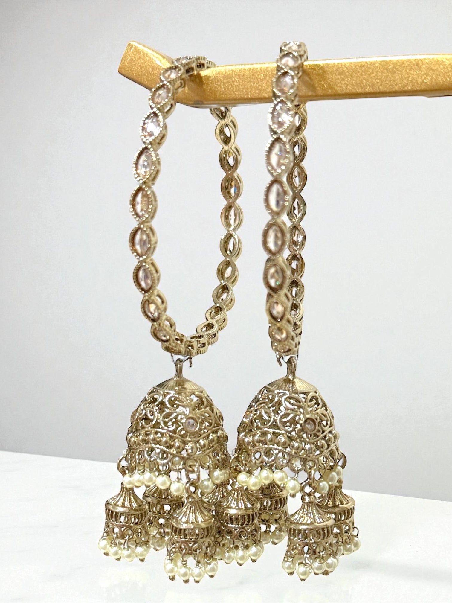 Graceful and unique, the Nisa kaday set blends traditional charm with delicate detailing. Each bangle is crafted with Polki stone accents. What sets these bangles apart is the elegant jhumka charm that hangs from each kada. Perfect for festive occasions or adding a touch of refinement to your ensemble, Nisa captures beauty in every detail.✨