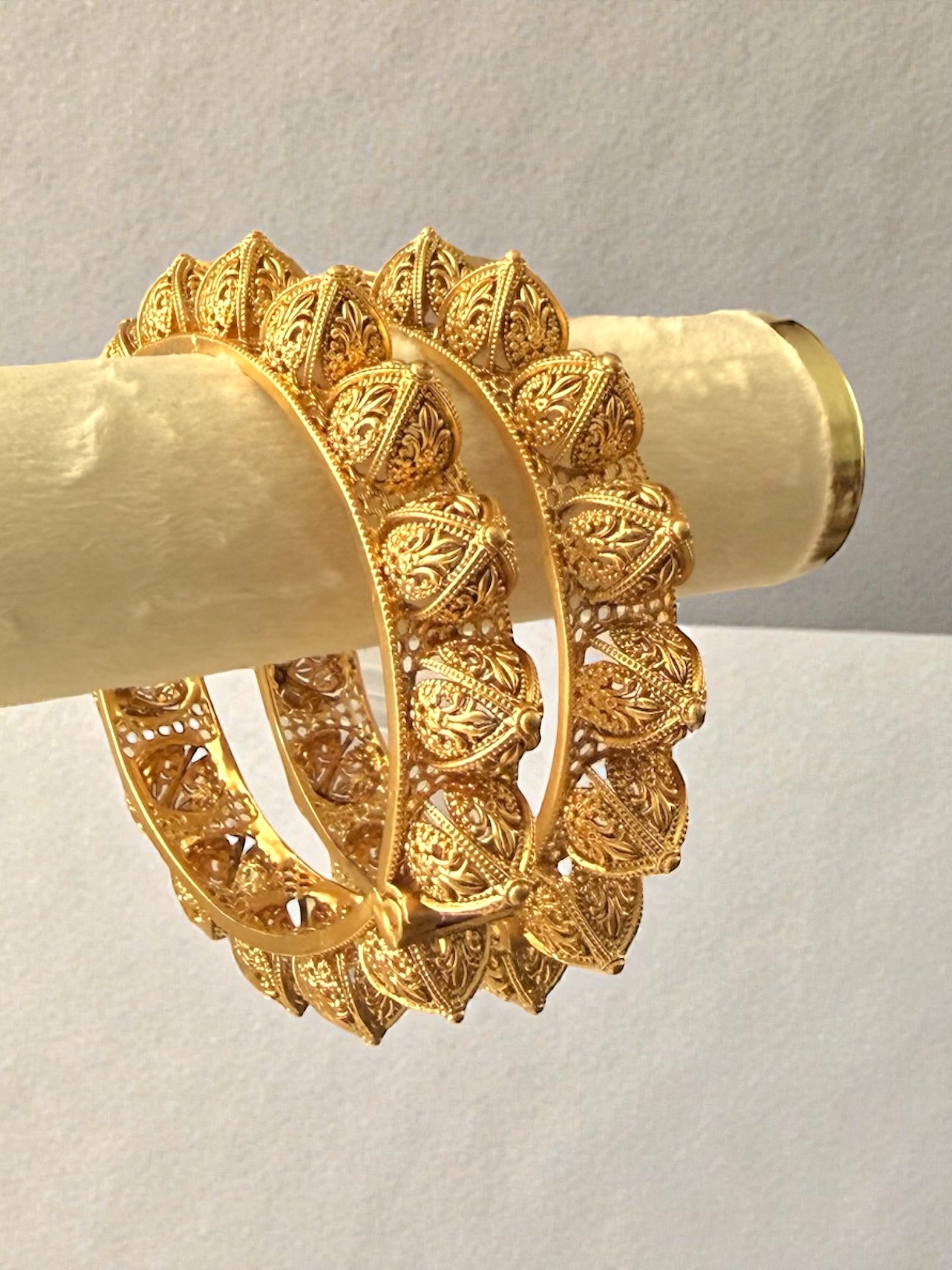 Elegant in its simplicity, these kaday are a pair of gold bangles that speaks volumes through intricate detailing. Handcrafted with fine patterns etched into the metal, it reflects timeless craftsmanship and quiet strength. Whether worn alone for a minimalist look or stacked with other pieces, they adds a refined touch of tradition and sophistication to any outfit.✨