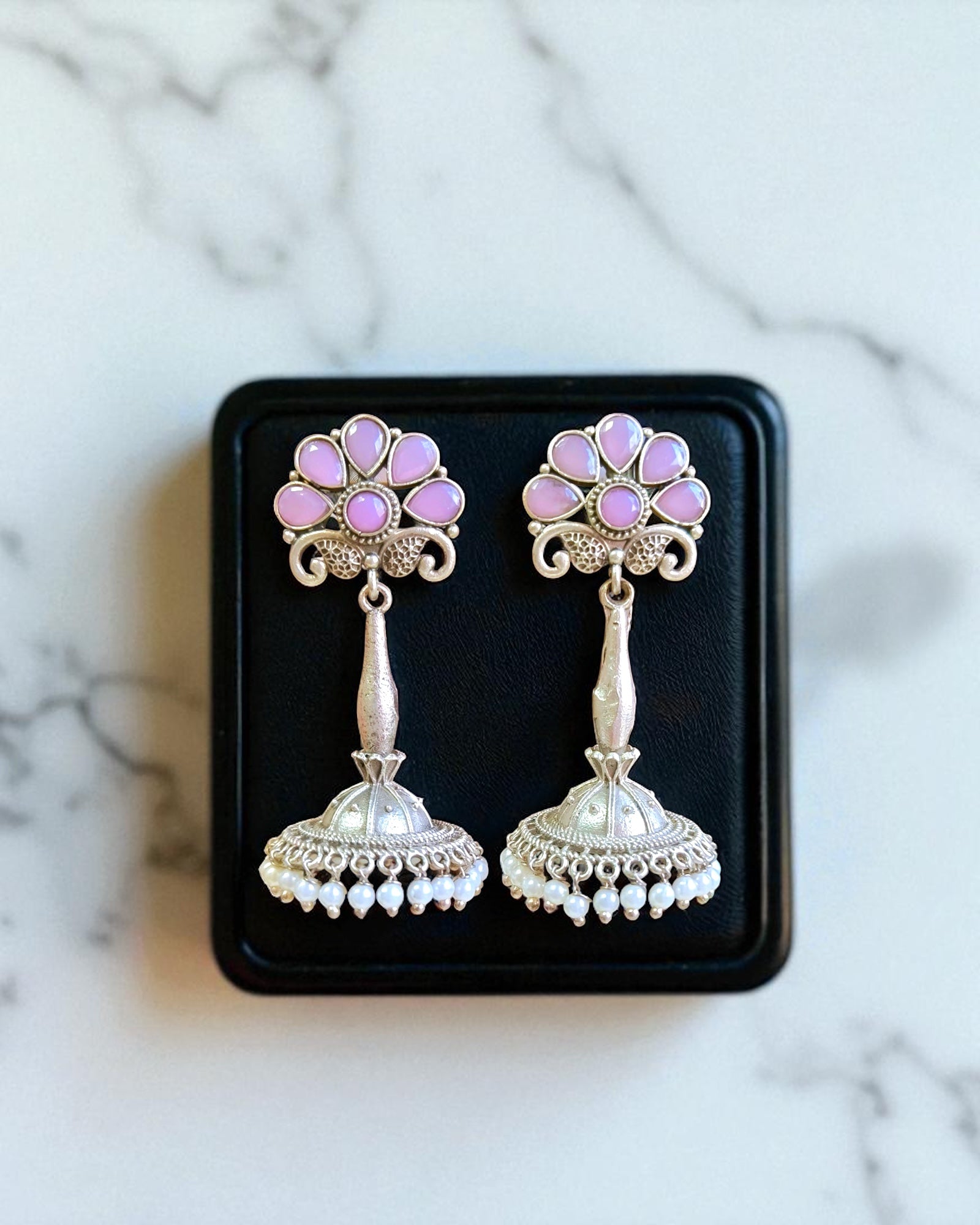 Elegant and artistic, Rhea—meaning “flowing” or “singer”—is a stunning pair of matte-finished jhumkas featuring a graceful peacock-inspired stud and intricately carved dome-shaped drops adorned with delicate pearl accents. Crafted from high-quality brass that is nickel, lead, and cadmium free, this piece is 925 silver plated with an antique oxidised finish. Lightweight yet statement-worthy, these earrings are perfect for ethnic wear, fusion outfits, or adding a touch of timeless charm to your everyday look.✨