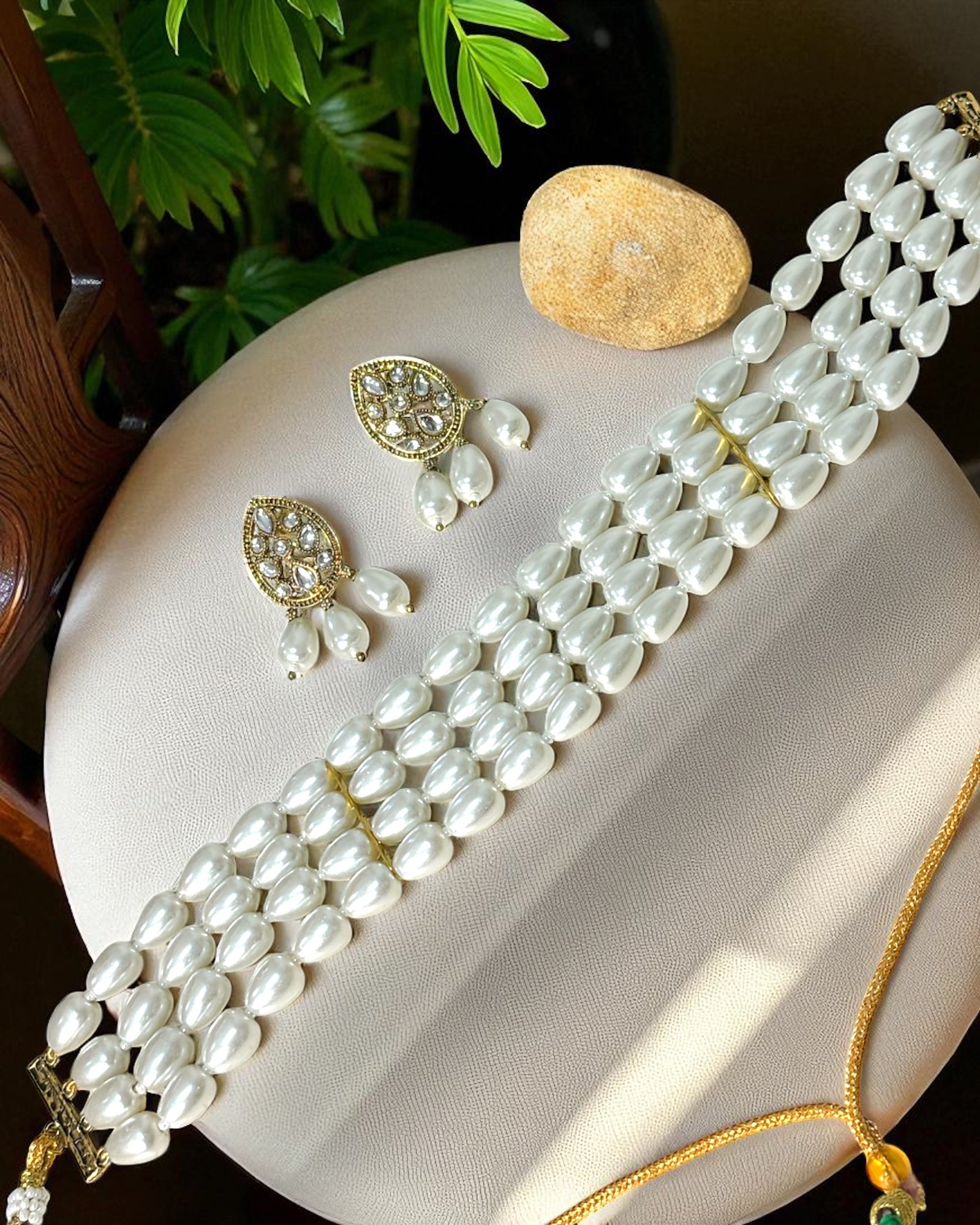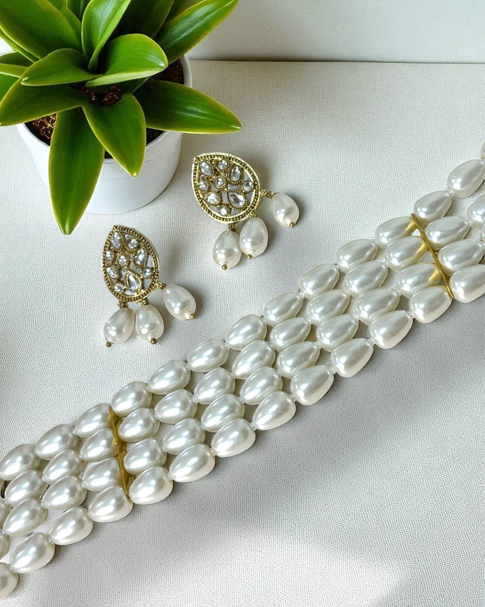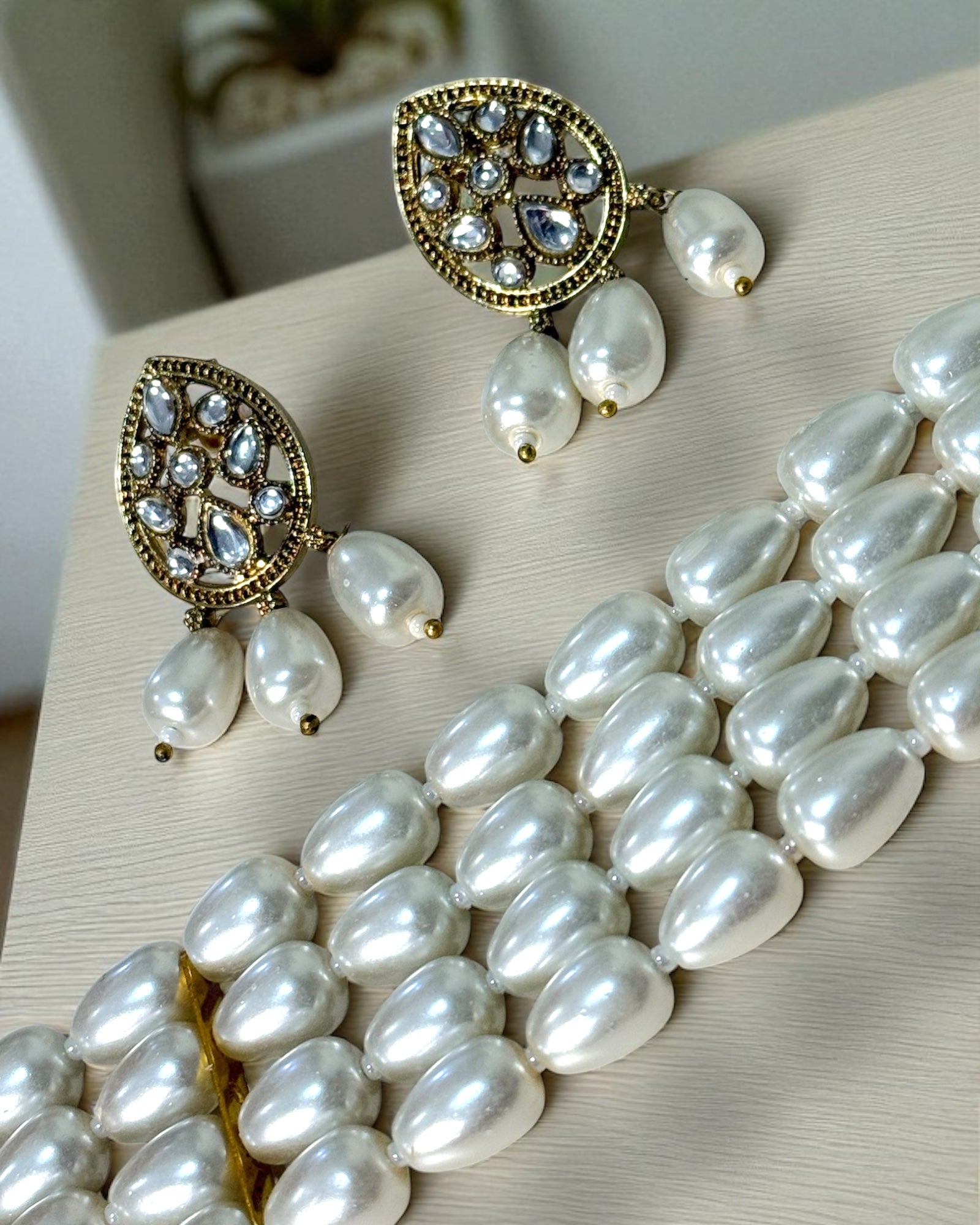 A name that means soulful or spiritual, Ruhani captures the quiet elegance and divine beauty of timeless design. This set features a striking four-line choker made with glossy teardrop pearls, perfectly strung to sit gracefully around the neck with a structured, luxurious finish.✨