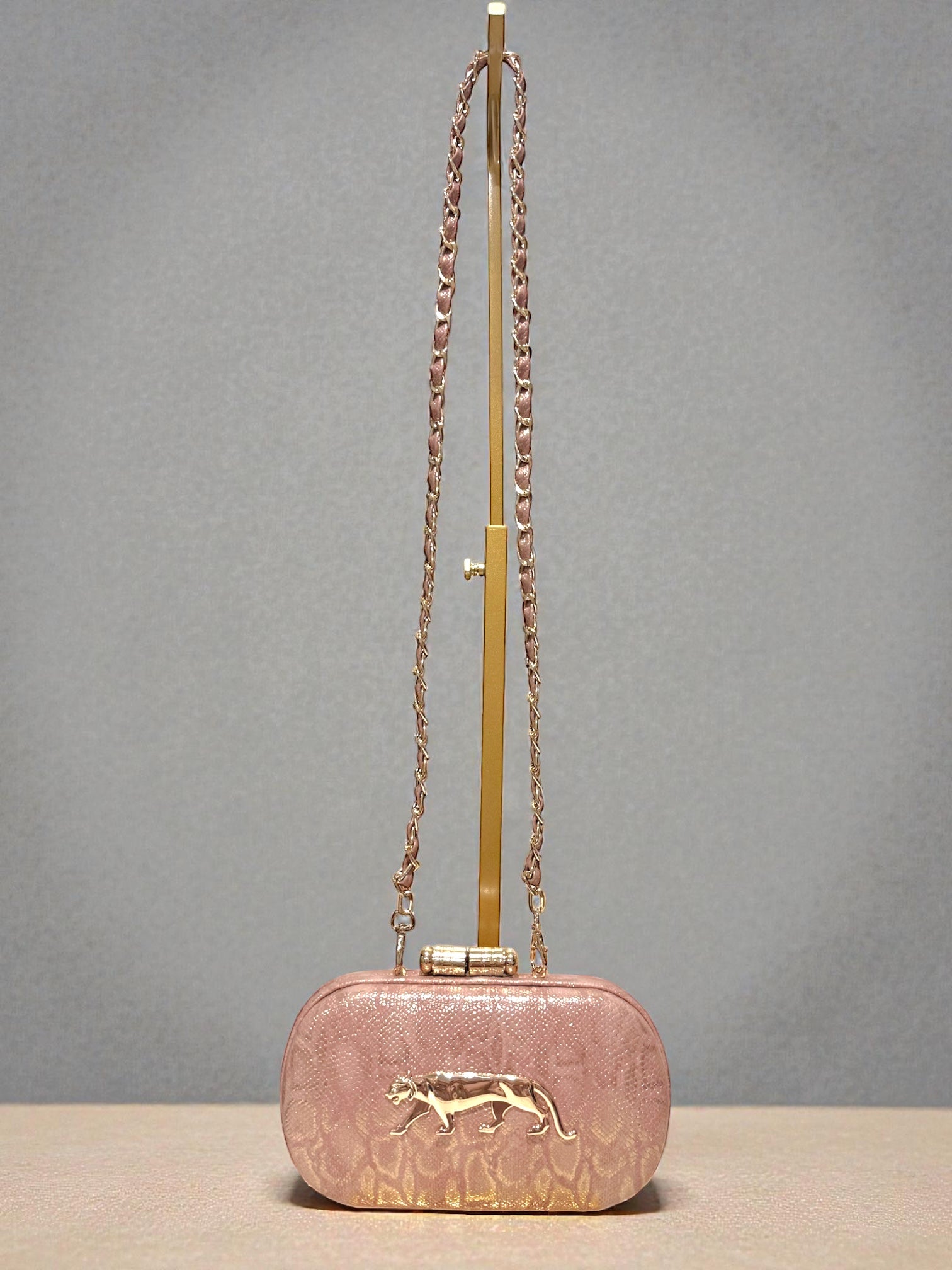 Elevate your look with this stunning blush-pink box clutch, featuring a luxe snakeskin-textured finish and a bold gold panther emblem.