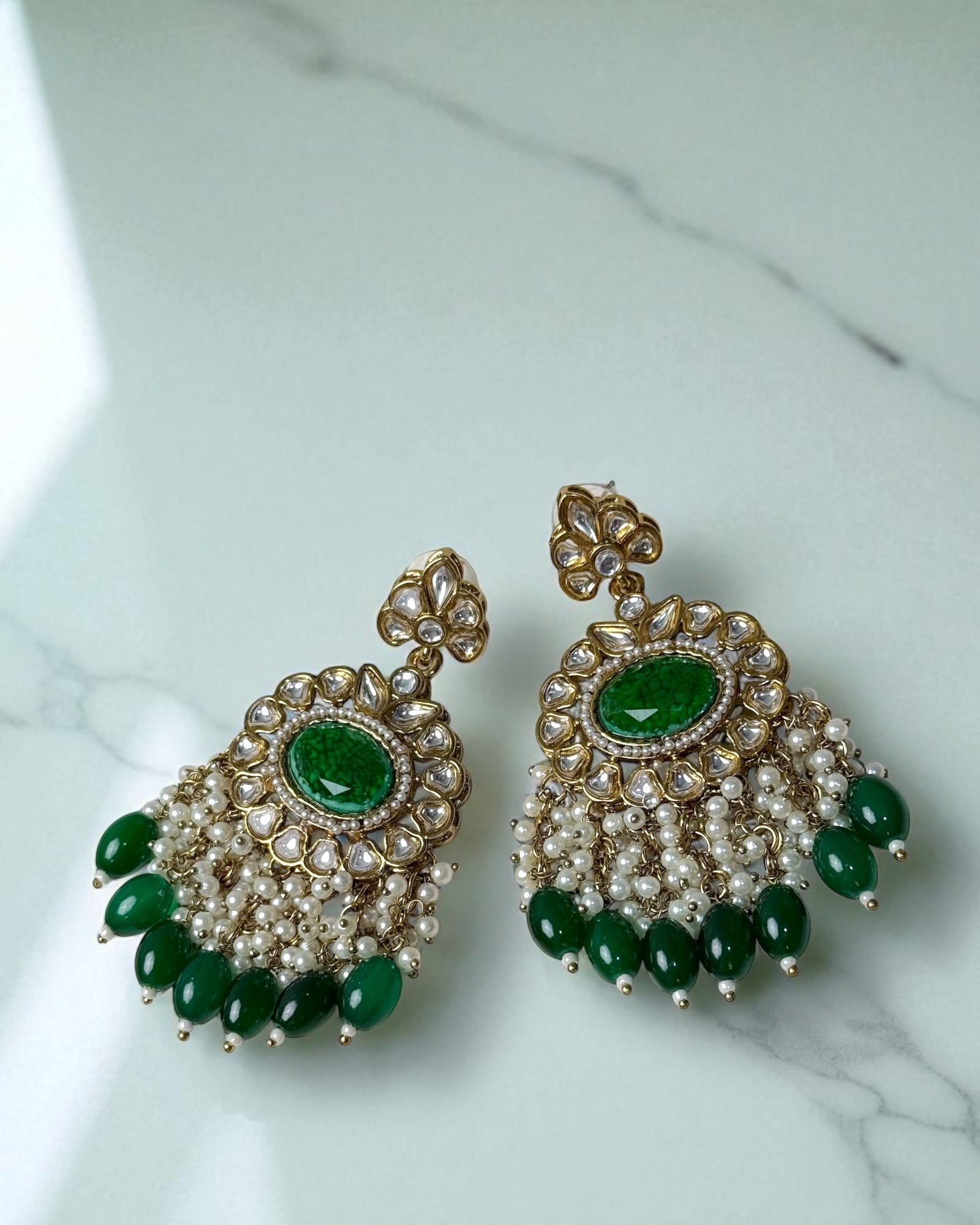Rooted in tradition with a refined twist, Tishya is where timeless elegance meets festive flair. These Kundan earrings feature a bold center stone surrounded by delicate hand-set details, with pearl clusters and rounded bead drops that add rich texture and graceful movement.✨