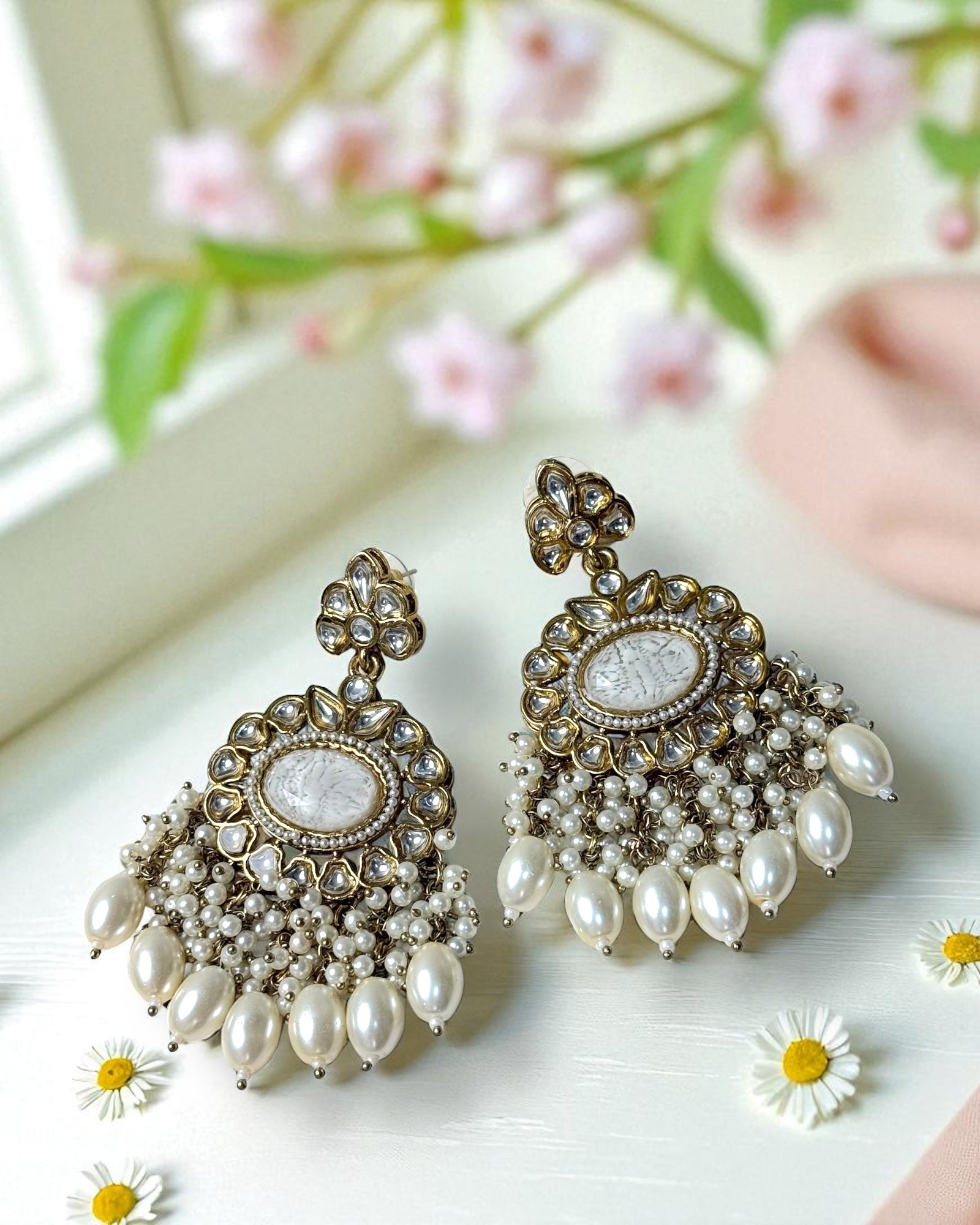 Rooted in tradition with a refined twist, Tishya is where timeless elegance meets festive flair. These Kundan earrings feature a bold center stone surrounded by delicate hand-set details, with pearl clusters and rounded bead drops that add rich texture and graceful movement.✨