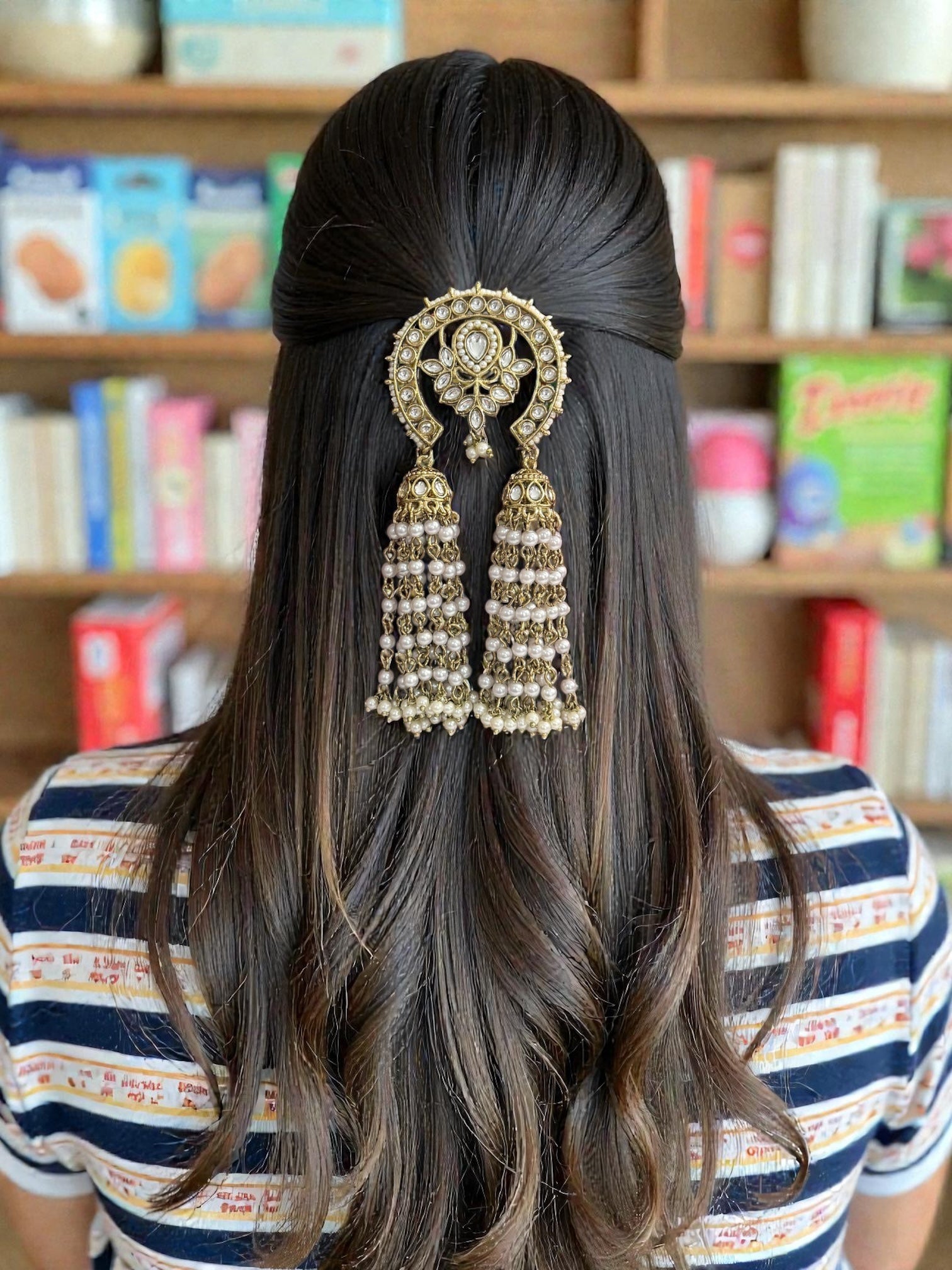 This is a Kundan hair accessory that can be hooked to any part of your hair. Traditionally, it is used in braids, or half up, half down hairstyles. There is a hook in the back. ✨